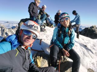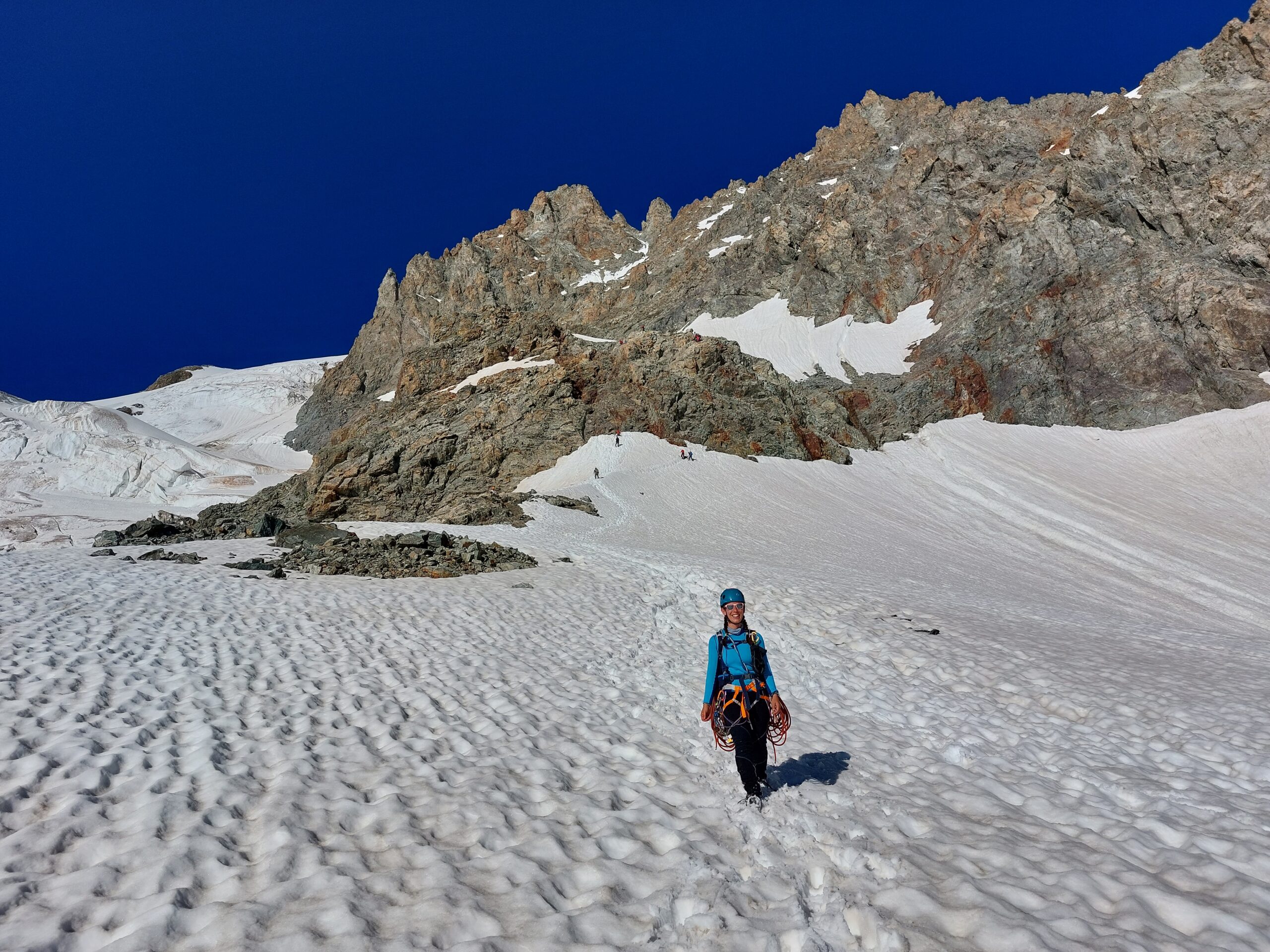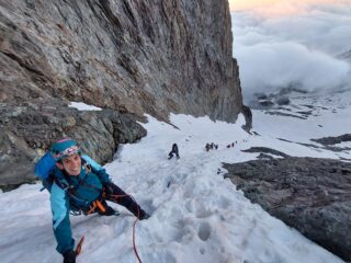 Partenza alle 3.15 circa, scarso rigelo sui primi nevai che però poi va a migliorare nel canalino del Coolidge. Ramponi indossati fin dal secondo nevaietto e tenuti fino a dopo la prima doppia. Alle condizioni attuali sufficiente una picca a testa.