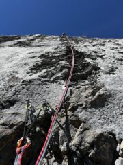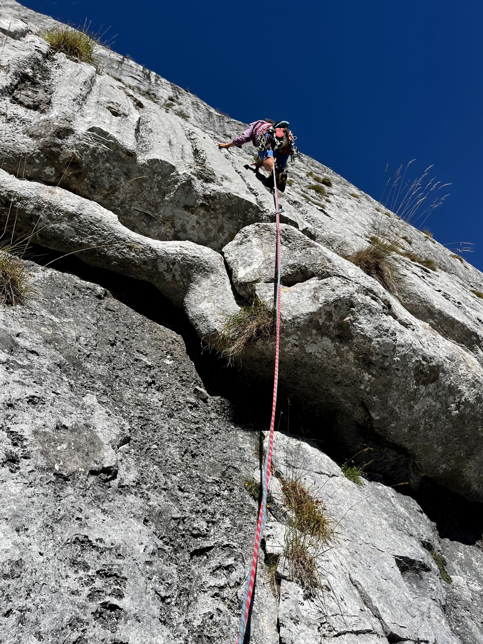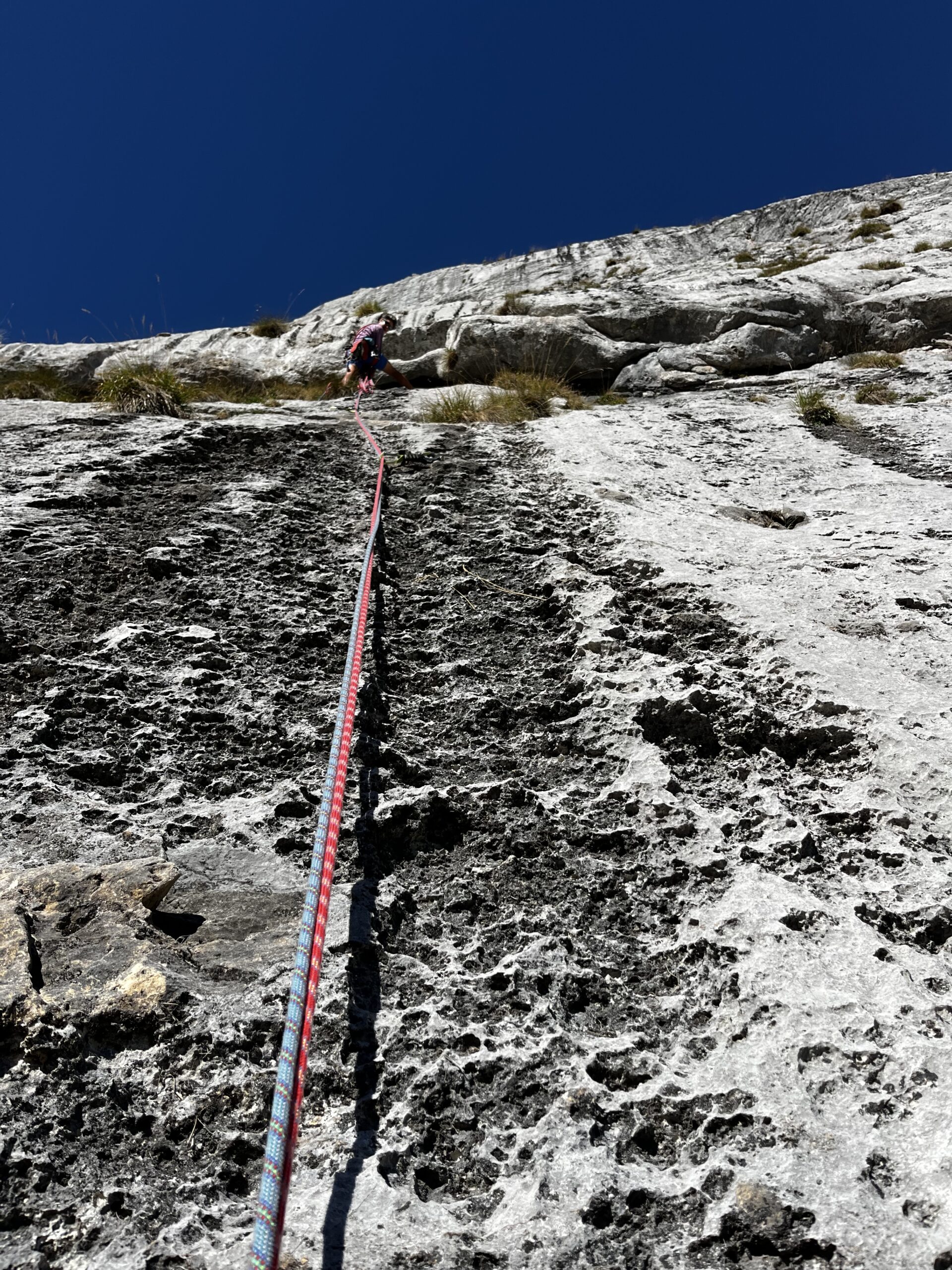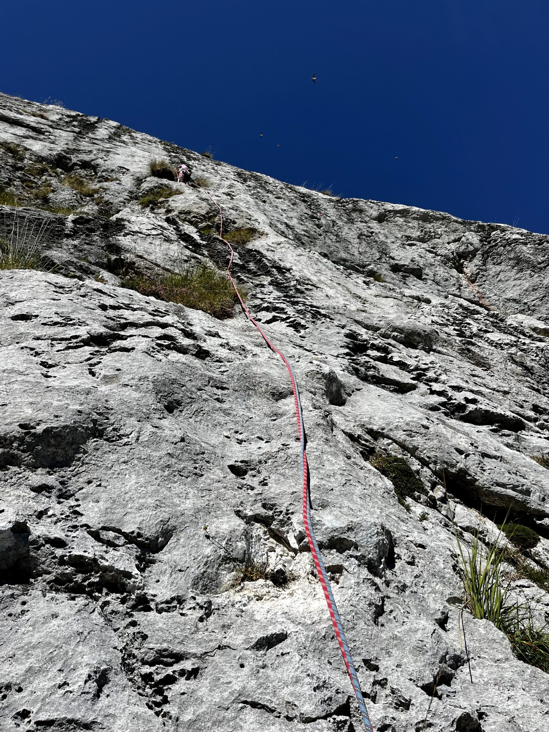 Primo tiro con inizio in diagonale verso sinistra un po’ disturbato dall’erba. Prima sosta alla base di un piccolo strapiombo. Tutte le soste su due spit (ottimi) da collegare e anelli di calata.