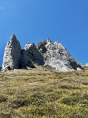 Attacco tra le due punte nord e sud, un po’ più in alto rispetto alle vie che la precedono, cordone scuro in una clessidra alla partenza, sulla sinistra di una nicchia erbosa.