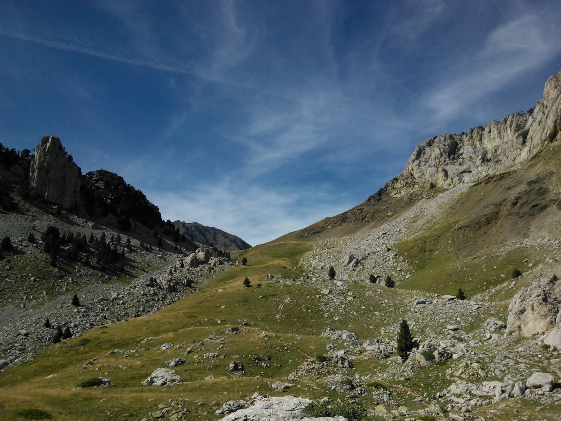 Si segue una traccia di sentiero sulla spalla erbosa che parte proprio allo sbocco del canale e si scende poi per prati verso Formigal (la discesa è comunque evidente, avendo Formigal proprio di fronte e non essendoci salti di roccia). In breve si ritorna all’Hotel Aragon.