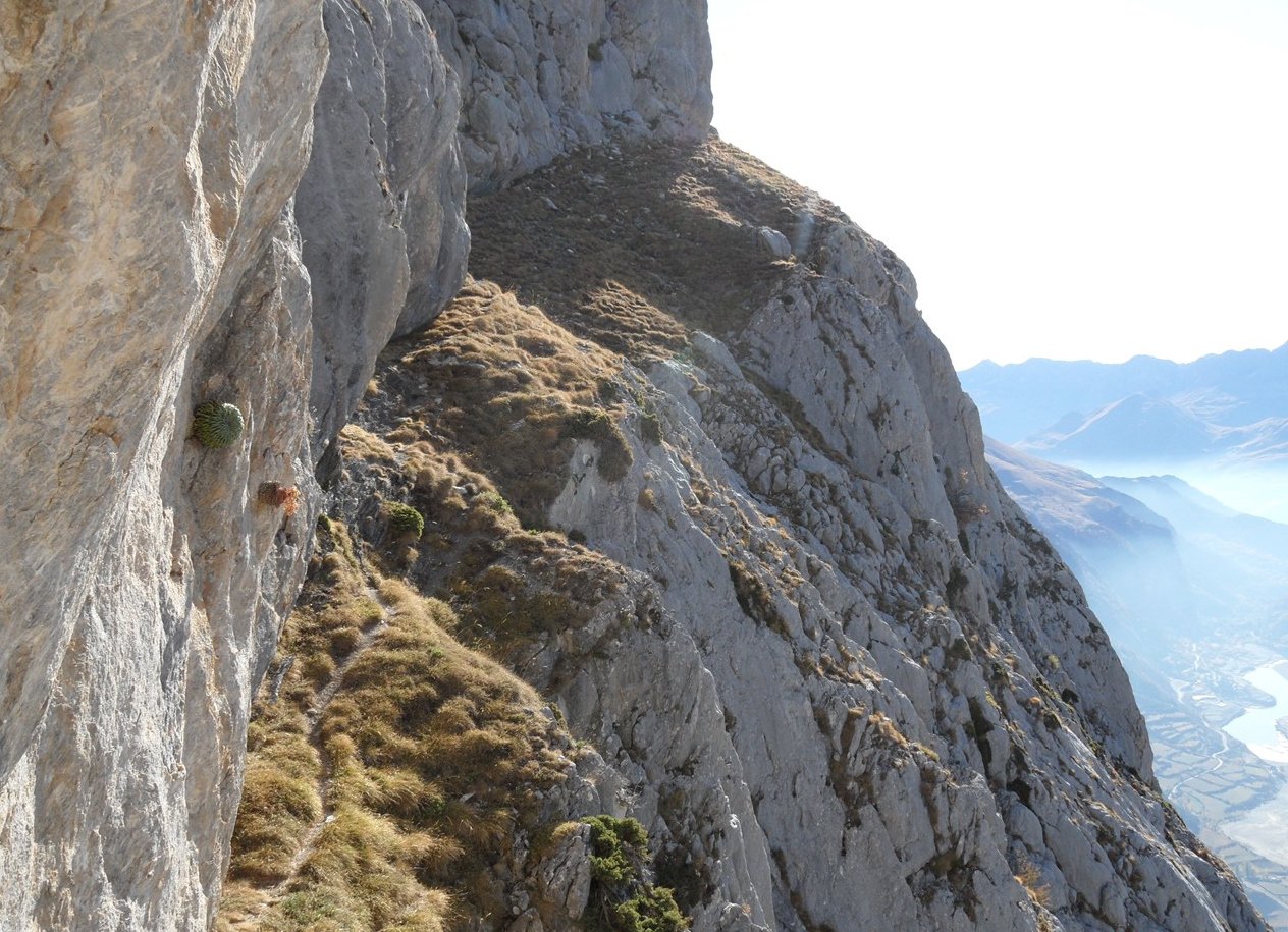 Ritornati in breve all’intaglio comincia la parte più impegnativa. Affacciandosi dall’intaglio sul lato Formigal, si scende per un breve canalino e si nota un’ampia cengia erbosa che taglia tutta la parete sud. La si percorre (vd foto). La cengia va in leggera salita, proprio nel punto in cui diventa pianeggiante, sulla parete, sulla sx, si nota un camino con una freccia rossa. Seguendo i bolli rossi, si sale per roccette rosse e camini con passaggi di I, II e II+. In 30 minuti si è in cima. Si scende dalla stessa via di salita, arrampicando.