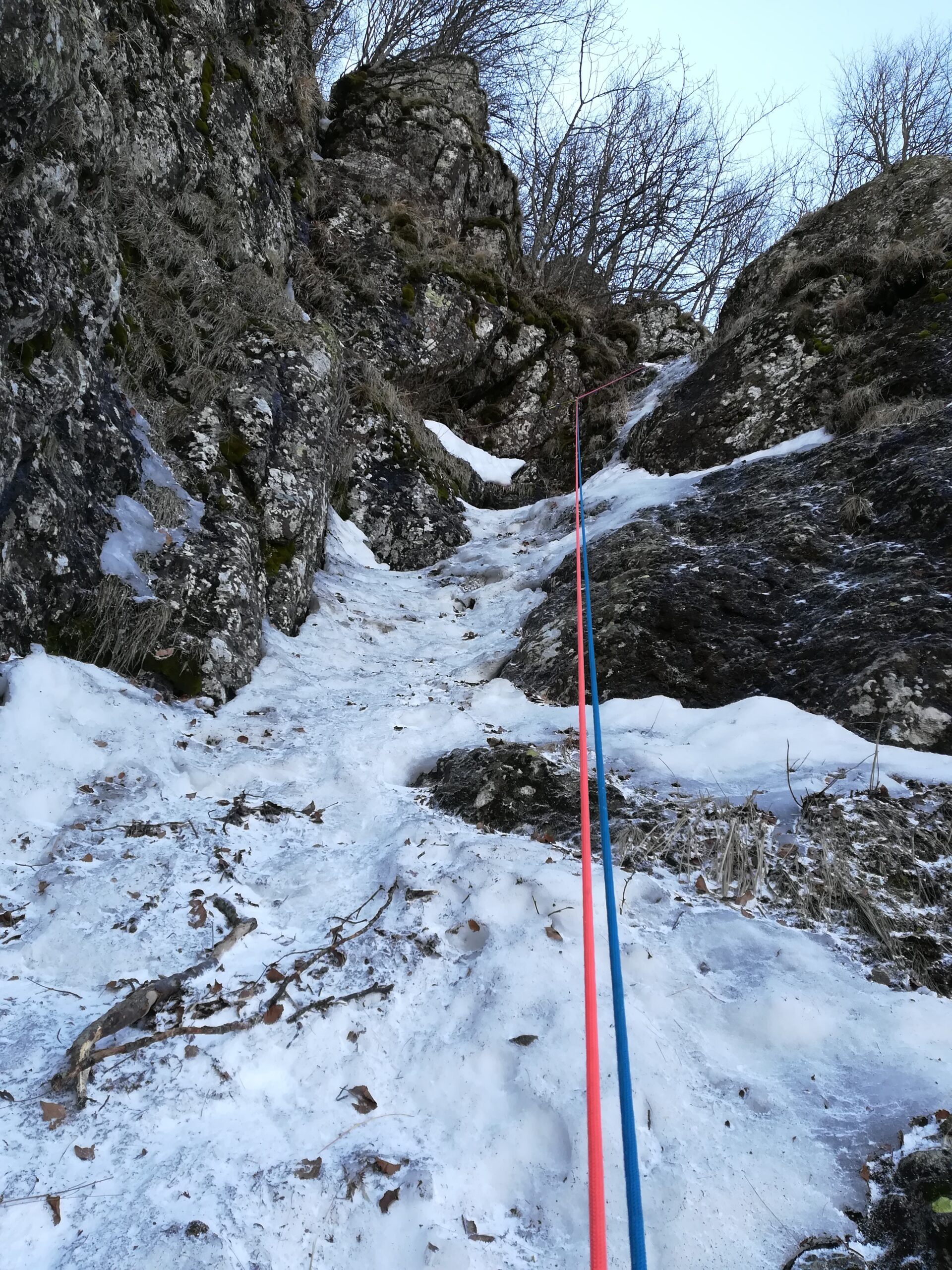 Canale ancora in condizioni ottime, per gran parte su neve ghiacciata stile goulotte. Ad averle avute, ci stavano anche le viti! Un po’ snaturato dalle tante peste, in alcuni punti c’è rimasto poco ma la copertura è ancora abbondante, soprattutto in alto.