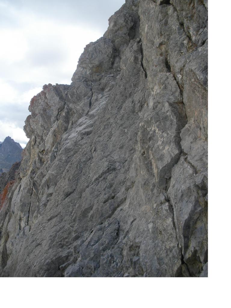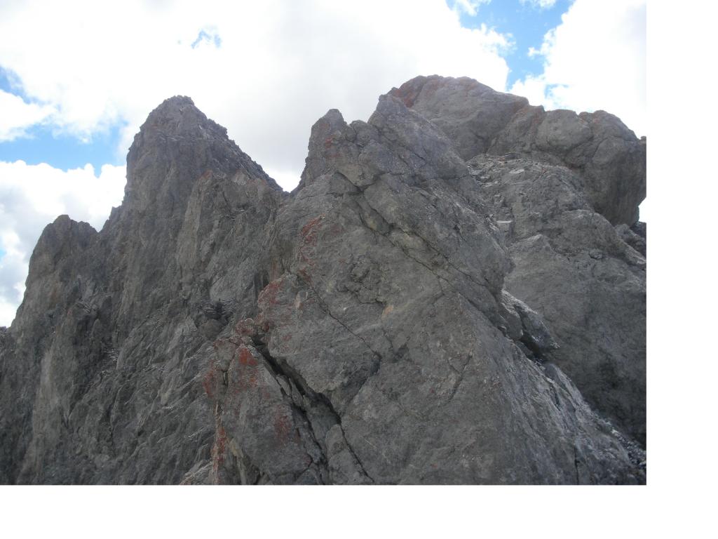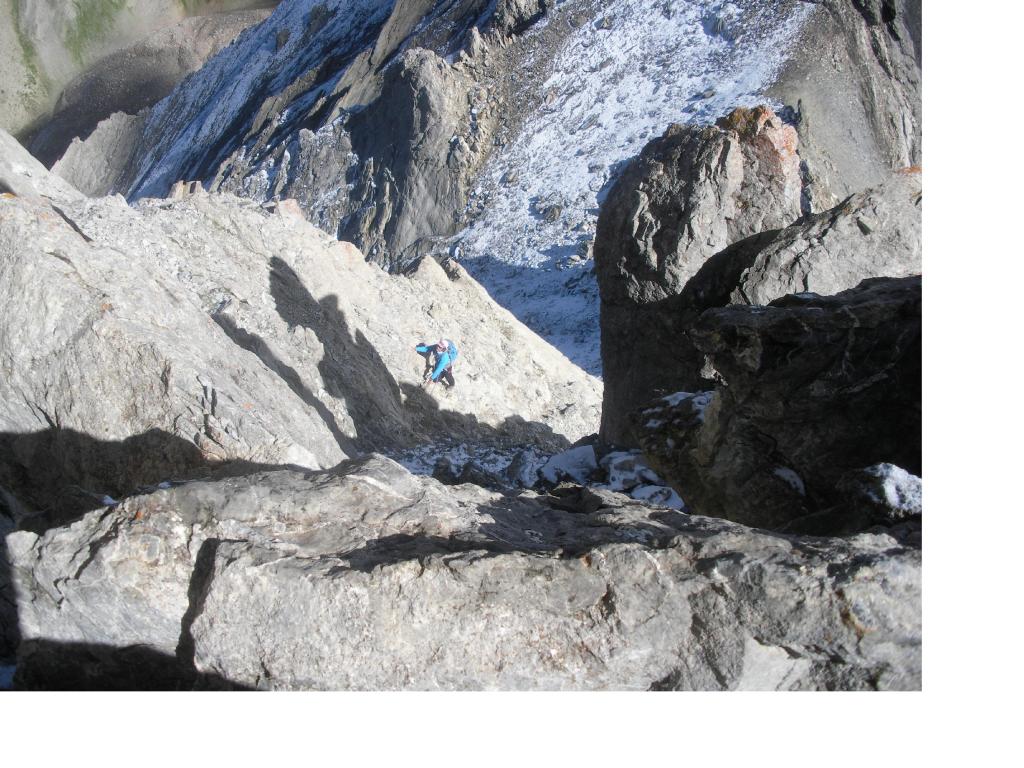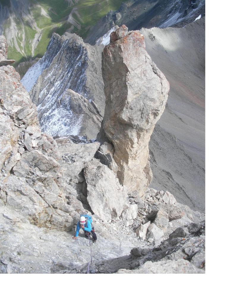 Da lì seguire la cresta aggirando al meglio sulla sx o dx gli spuntoni rocciosi che la movimentano: I, II, più due brevi traversi, il primo massimamente esposto lato Ubaye(sx) ed il secondo da superare di forza con passo del gatto in una breccia ascendente a sx aggettante, III e IV-. Seguono ulteriori passaggi a dx e sx al meglio fino ad un ultimo spuntone da cui si prospetta molto bene la cuspide sommitale (o meglio, quella che auspicavamo tale, e fortunatamente lo era), tragitto di circa 15/20 min da compiere sulla dx (lato N), quasi agevole, visto ciò che ci ha preceduto.