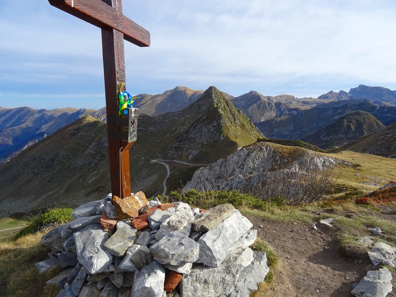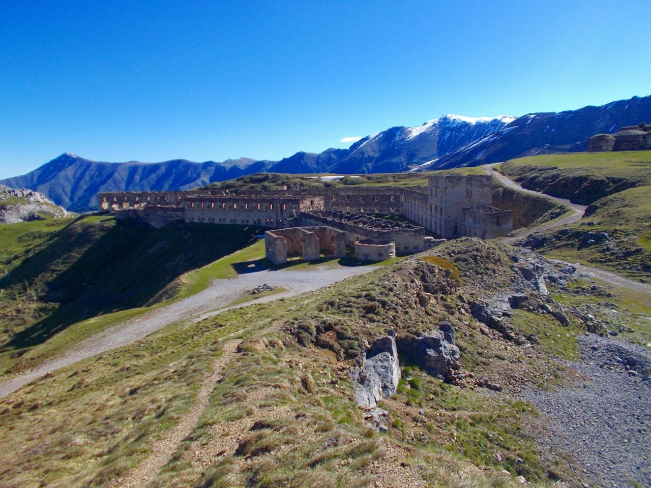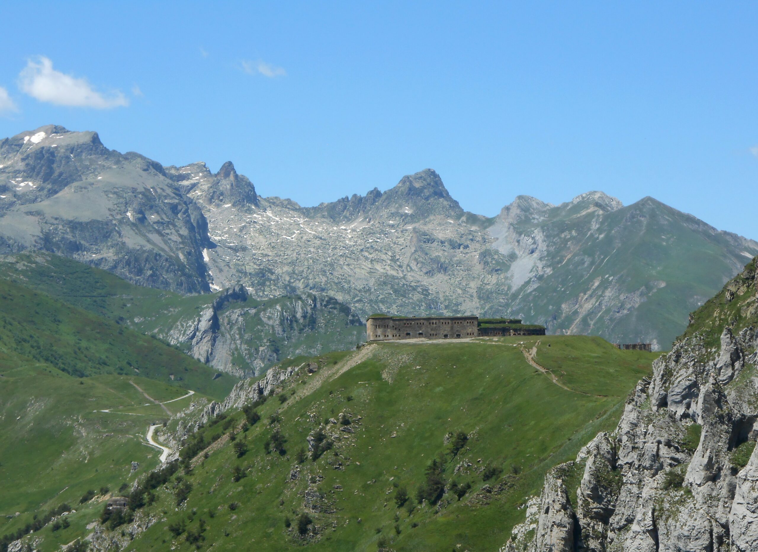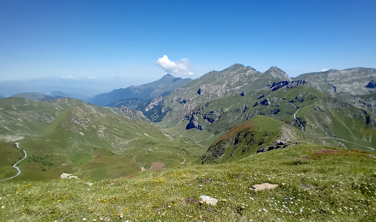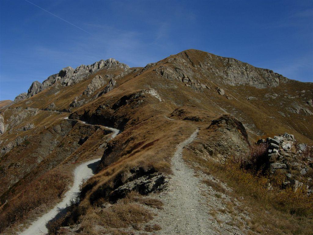 A questo punto non ci resta che tornare indietro lungo la bella strada sterrata (bellissimo tornante sostenuto su muri che da su Limone) e arrivare fino al colletto Campanin m.2142. Qui lasciare la strada e prendere il sentierino che verso sinistra sale verso il Bec Roux e da qui a ritroso scendere al bivio per il Forte Taborda e Pepino (pal 338)e poi per strada fino al colle di Tenda come all’andata.