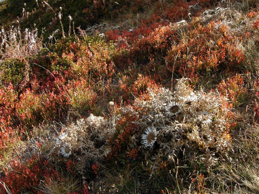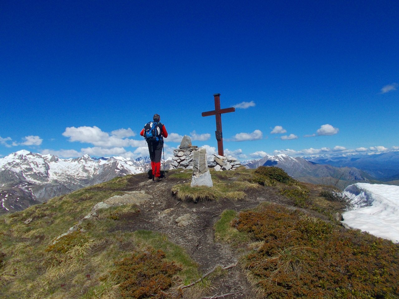 Dalla vetta tornare un pezzo indietro fino alla sella tra la cima e l’anticima e scendere per il pendio in diagonale per andare a riprendere il sentiero GTA lasciato prima che prosegue verso il Colle della Perla. Su bella stradina erbosa a tratti ridotta a sentiero aggirare la quota 2264 (lato Francia) e al colletto successivo risalire il crinale su tracce e erba della Cima del Becco (dove arrivava la stradina) cippo di confine. Scendere dall’altro lato su erba e detriti per andare a riprendere il sentiero lasciato prima e arrivare fino al Colle della Perla. (pal 326a) Vecchia caserma ormai ridotta a rudere sul lato destro del colle. Qui incontriamo la strada Monesi – Limone e a destra il bivio per la Vacherie de Valmaurina che si vede nella conca in basso (Sbarra e divieto d’accesso). Lasciato il bivio per la vacherie a destra e la strada a sinistra ci incamminiamo su bel sentiero nel centro sul crinale che lasciamo appena prima della Cima di Cuni alla nostra sinistra per salirla per ripido pendio erboso e un ripido e sfasciumoso breve canalino. Giunti in vetta attenzione alla parete nord-ovest che precipita ripida, panorama sempre amplissimo ora aperto completamente verso Cima della Fascia, Testa Ciaudon, Marguareis, Conca e Cima delle Carsene, ecc. Dalla cima scendere per erba, rododendri e sfasciumi a ricongiungersi col sentierino che ci porta al Colle della Boaria m.2102. (pal.326) Al Colle ritroviamo la strada Monesi – Limone (sbarra chiusa) e una caserma anche questa mal ridotta.