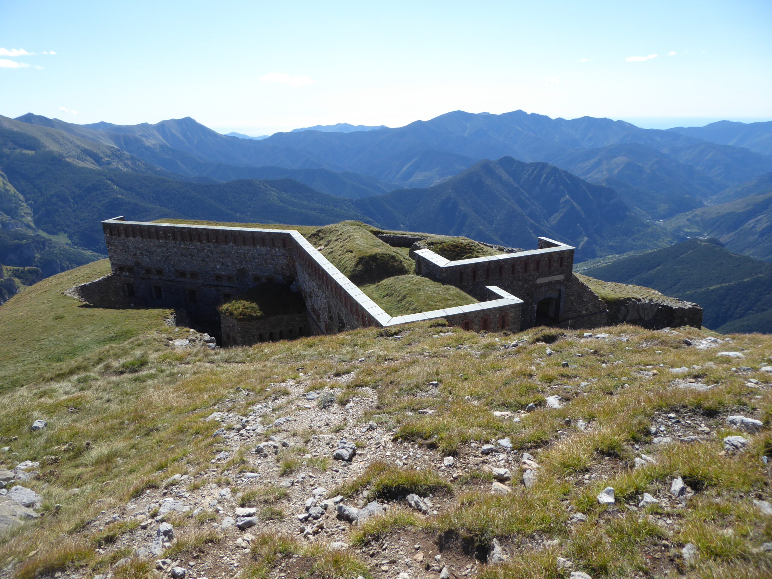 Ridiscendere sulla stradina e seguire le tracce e i segni della GTA che lasciano la strada per tagliare i tornanti e per crinale vanno in direzione del Pepino. Lasciare il sentiero GTA che verso sinistra (lato Italia) va verso il colle della Perla e per crinale su tracce arrivare prima sull’anticima e poi in vetta alla cima di Pepino, ometto e curioso gatto. Verso la Val Roia scendendo di poco si può vedere dall’alto il Forte Pepino e a destra il Forte Taborda oltre ai forti della cintura fortificata del Col di Tenda.