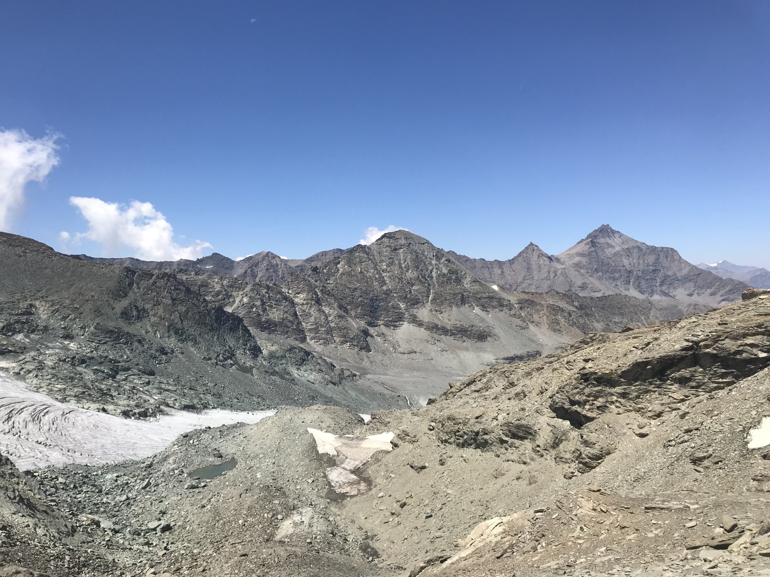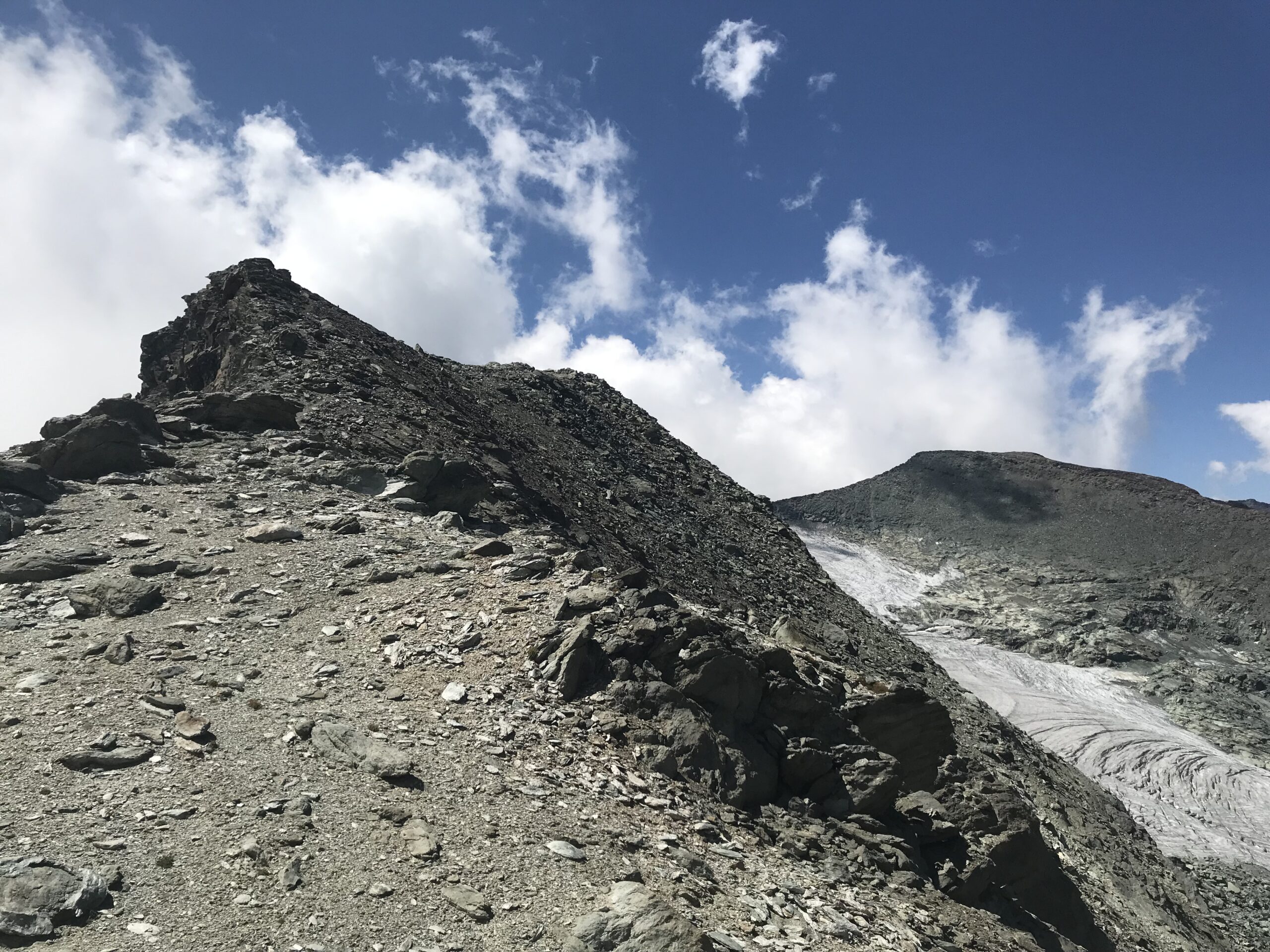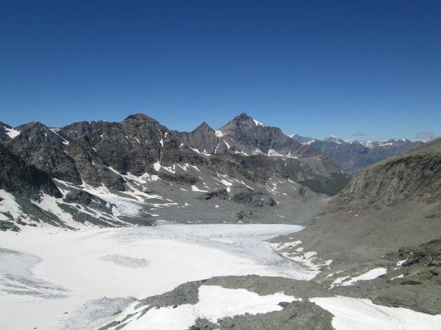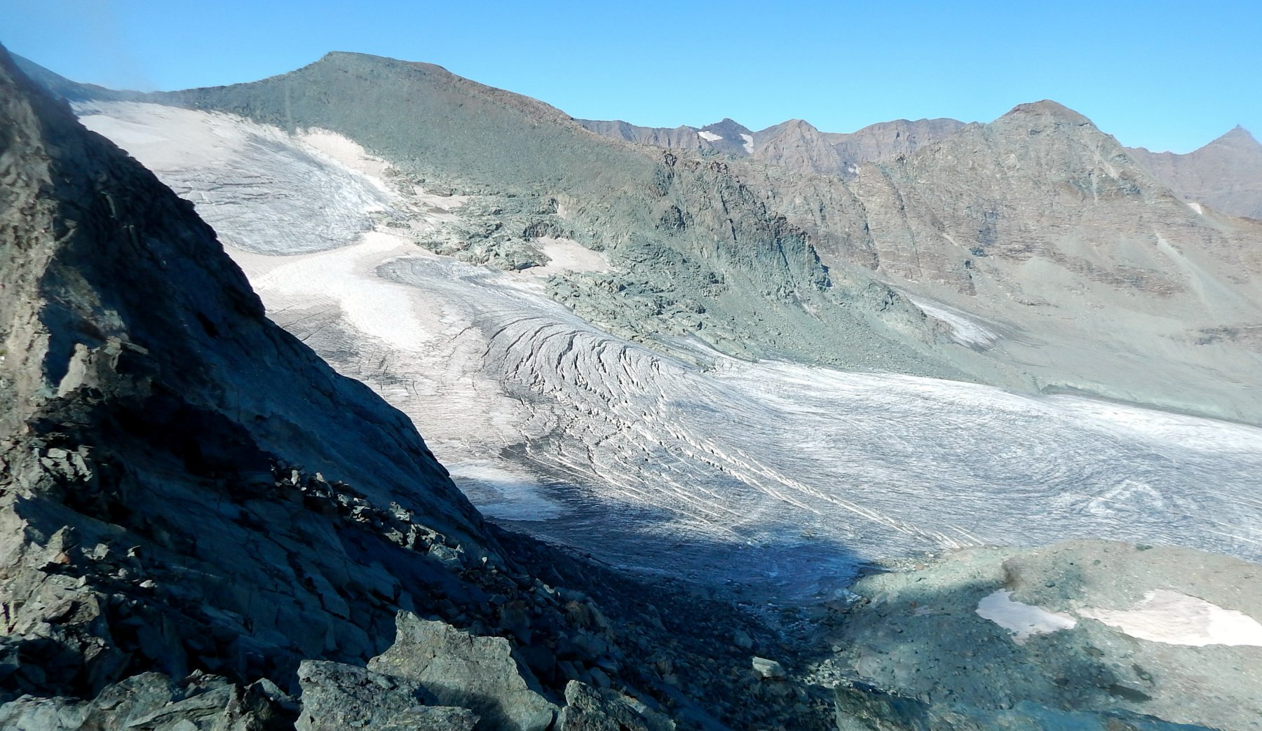 Magnifico panorama sulla parete rocciosa della Croce Rossa e sul Glacier de la Vallettaz, nonchè sui massicci della zona.