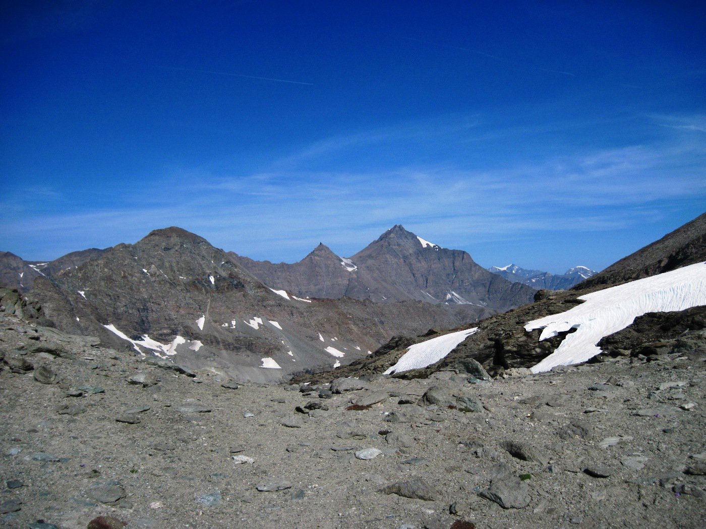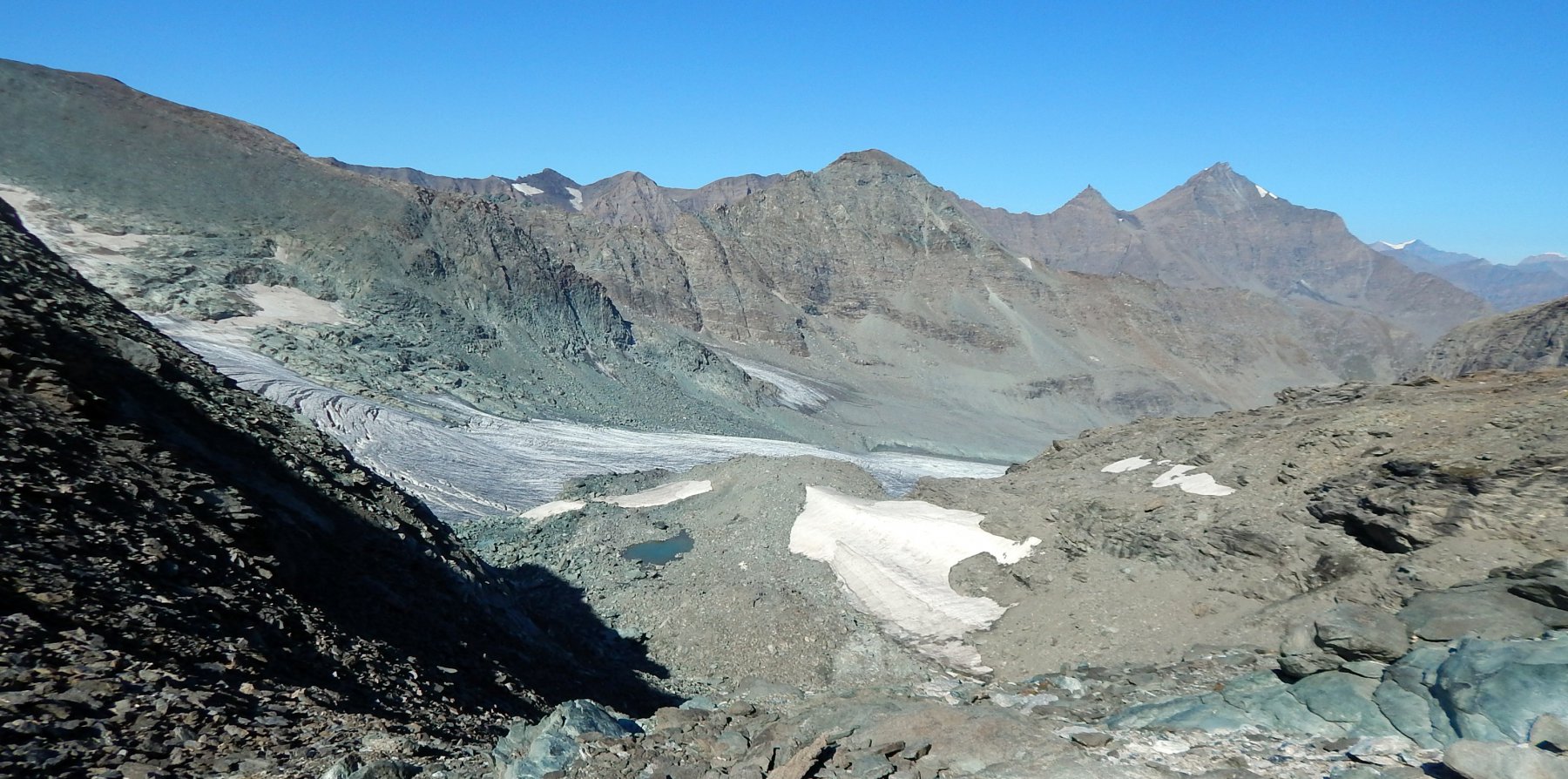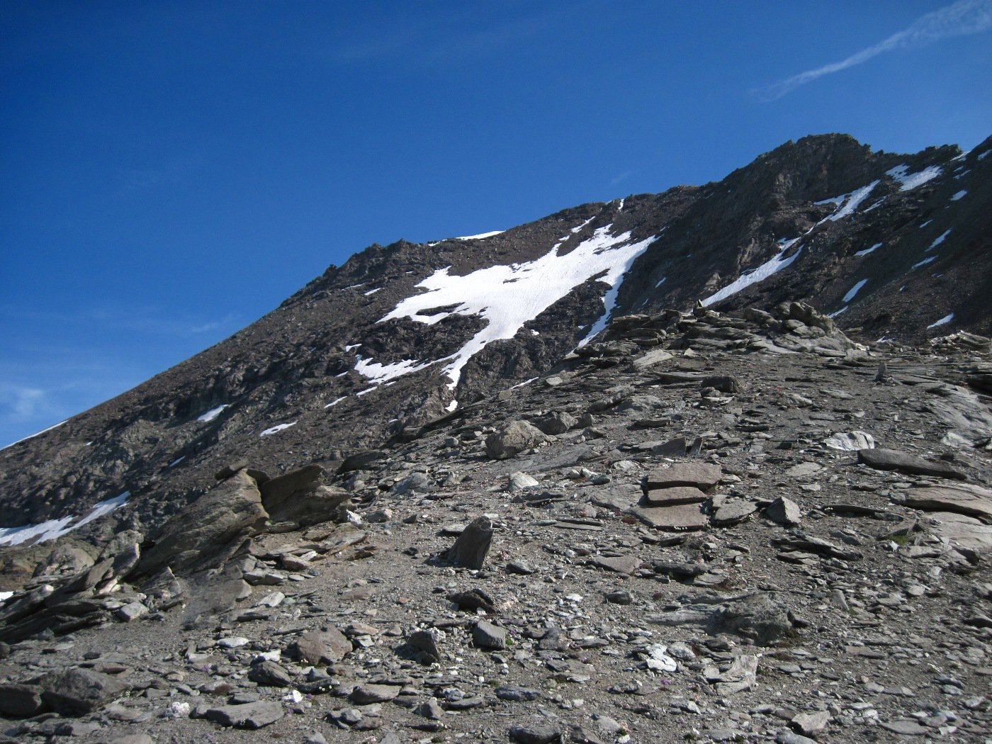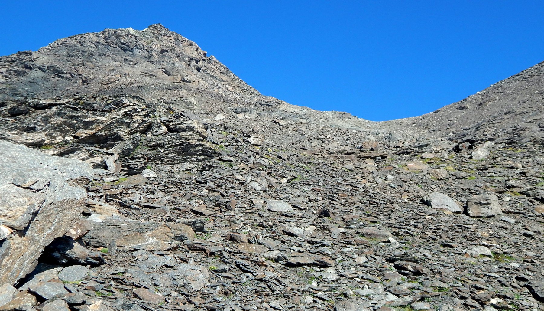 Dopo un breve tratto pianeggiante la traccia riprende a salire dapprima a NO poi appoggia a sx su pendii di pietrame . Giunta ad una quota di 3000 m circa, ritorna a dx (NO) e percorrendo delle distese di detriti quadagna l’ampia depressione del Colle della Valletta 3207 m .