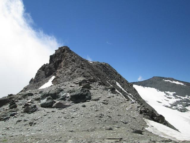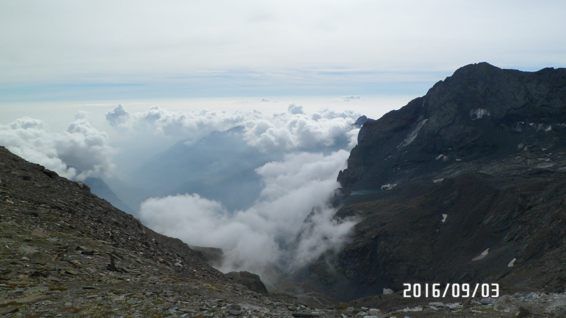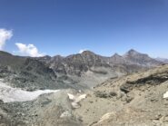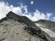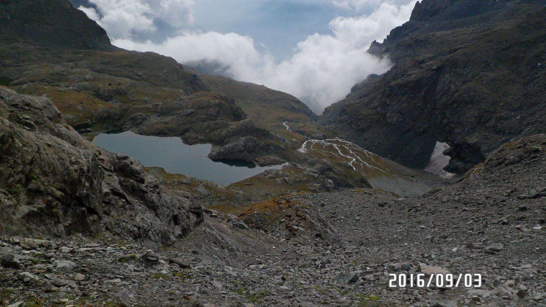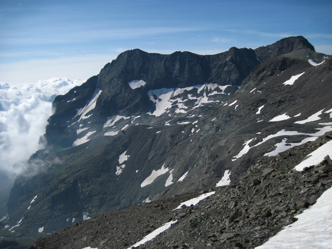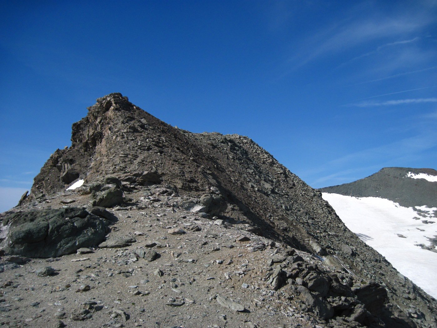 Dopo un breve tratto pianeggiante la traccia riprende a salire dapprima a NO poi appoggia a sx su pendii di pietrame . Giunta ad una quota di 3000 m circa, ritorna a dx (NO) e percorrendo delle distese di detriti quadagna l’ampia depressione del Colle della Valletta 3207 m .