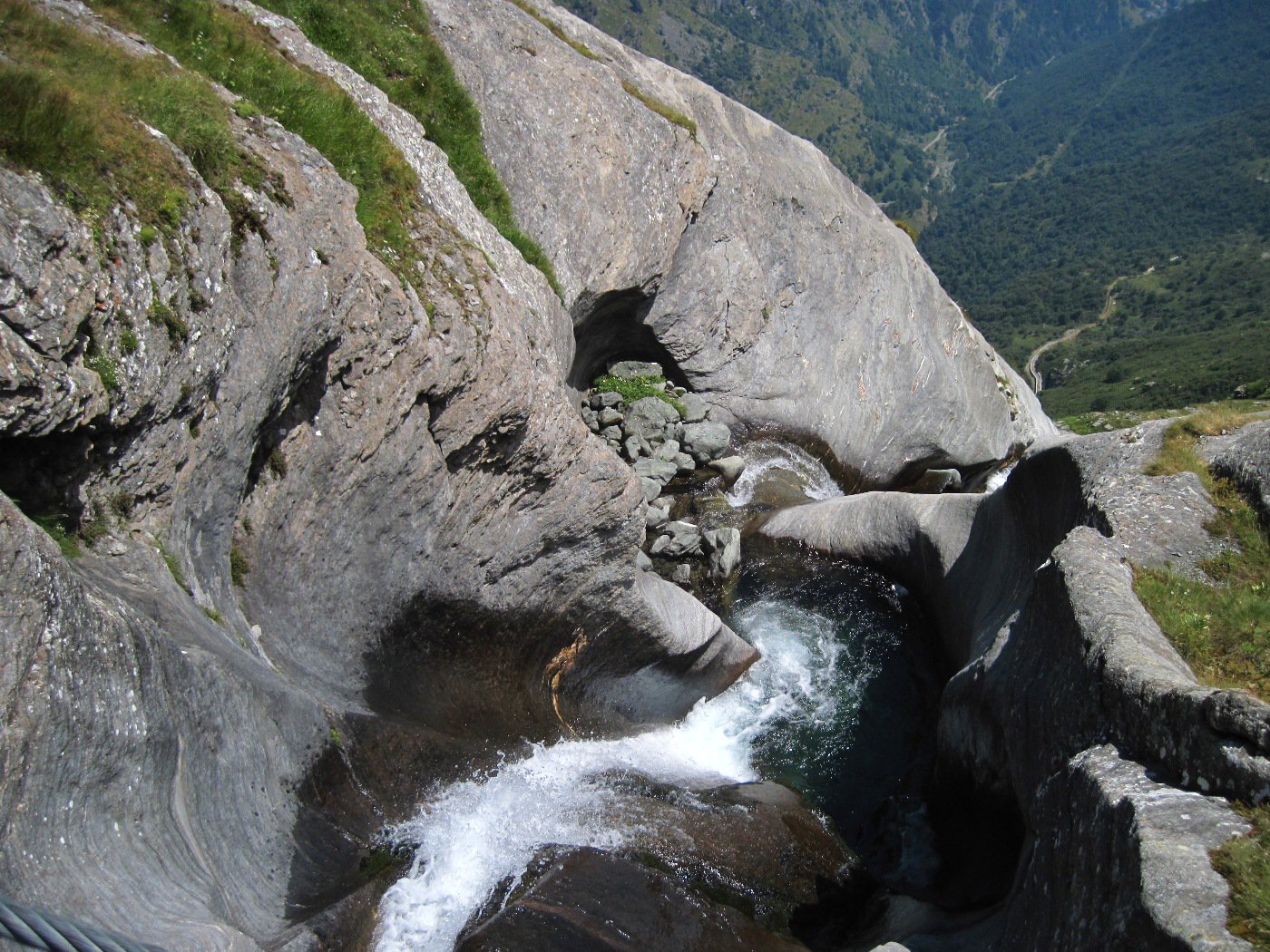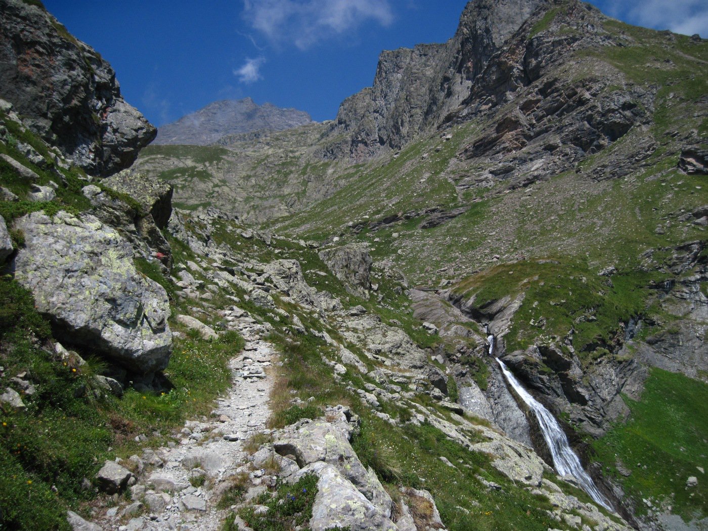 Il sentiero si alza e attraversa un canalone molto eroso, sale a svolte tra gli ontani, quindi esce su terreno aperto, e con ampi scorci sul vallone, quadagna quota alternando tratti in diagonale e brevi tornanti, fino a raggiungere la cascata del rio Peraciaval, sormontata dal ponte che si raggiunge con un breve tratto di discesa ( 2324 m).