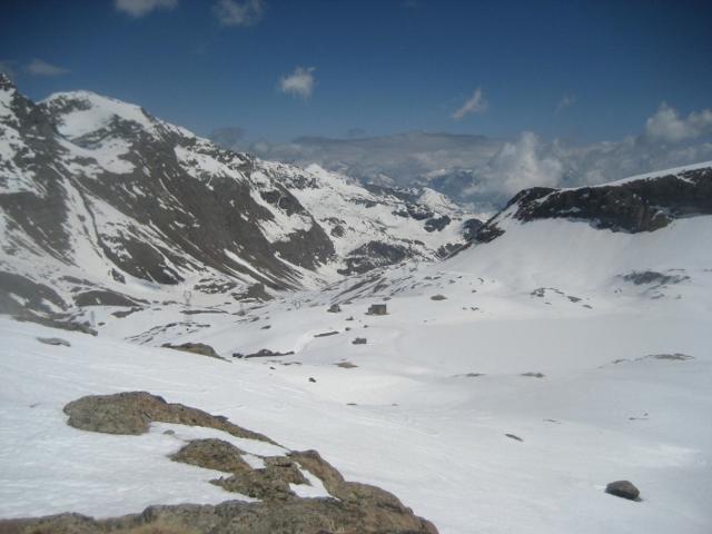 Sotto il colletto (del Costazza) abbiamo seguito le tracce presenti a sx, costeggiando il Bec Costazza meridionale appena sotto la sommità, fino in prossimità di questa cima (penso, sulla prosecuzione del Costazza sud, con ometto e croce -o palina- ben visibili perchè ormai molto vicini). Un breve traverso improvvisamente e decisamente troppo sfondoso (con possibilità di un “sufficiente volo” in caso di probabile slavinamento, ci ha indotto a scendere, a pochi metri dalla cima.
