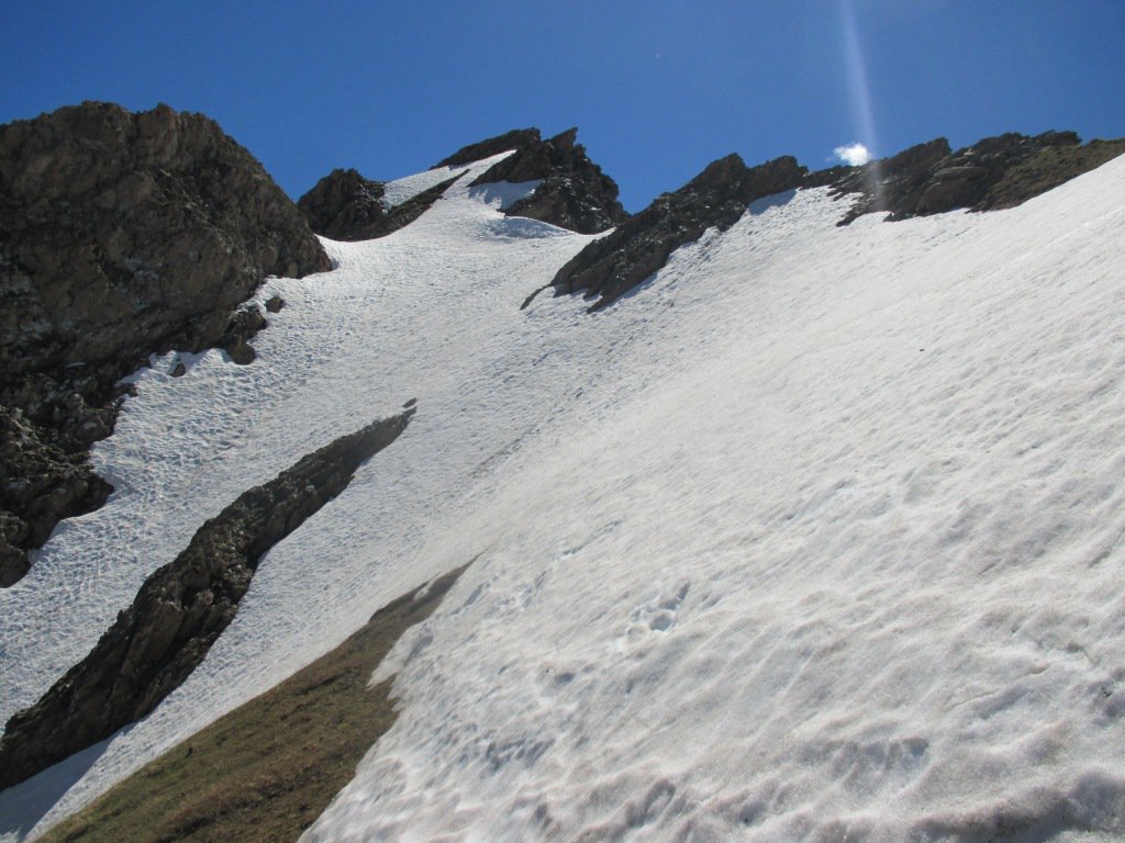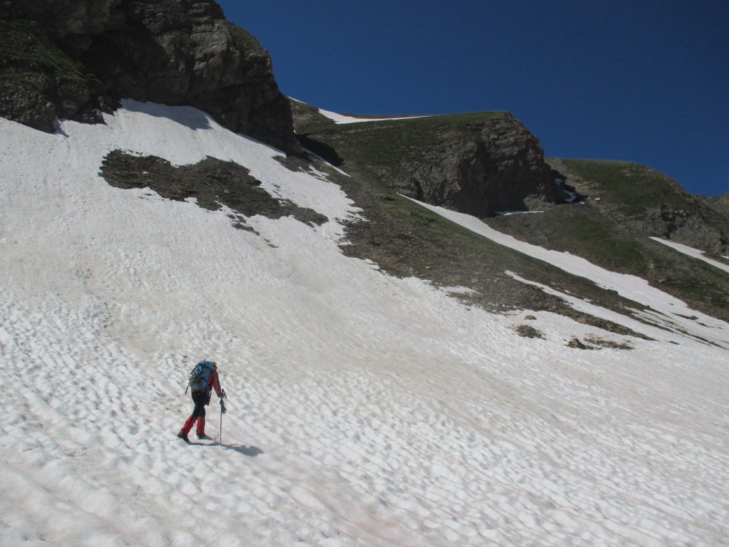 Dopo una serie di avvallamenti si arriva sotto la montagna e si inizia a salire sfruttando un cono detritico / erboso ripido. Il canale si impenna ulteriormente e diventa piu stretto e vicino alle rocce. In prossimità di una fascia rocciosa si passa sul fianco destro e sempre con tratto ripido si punta alla cresta est.