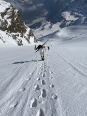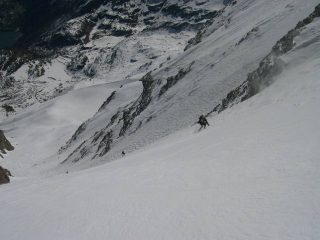 Salendo la pendenza aumenta, lasciando sulla sinistra il laghetto dell’ex Ghiacciaio del Forno. In breve, si arriva alla cengia dove è situato sulle dx il Bivacco Leonesi (2909 mt.), si prosegue generalmente tenendo la sinistra del canale, fino all’evidente strettoia e impennata del canale (circa a 3000 mt) dove le pendenze variano da 45-50 gradi (solo uscita), e raggiungendo il colle che in generale non presenta pericolose cornici (3290 mt.).
