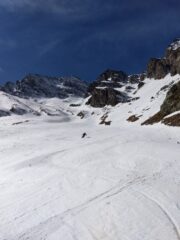 Parte appoggiata ghiacciata,poi ingresso bello ripido su neve per lo più morbida ma con lastroni a lato ben grippanti,a scelta dove passare anche considerando chi sale,oggi sfarinava un po’ giù,nulla di grosso ma può fare perdere l equilibrio.