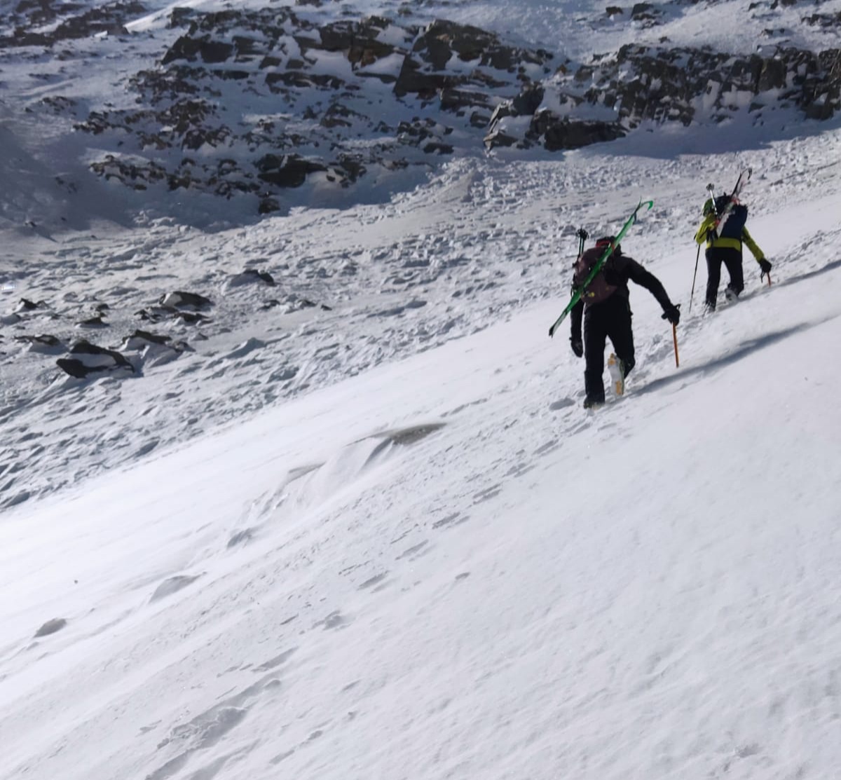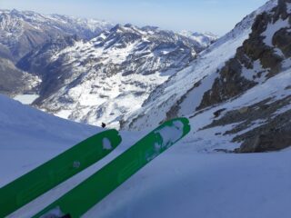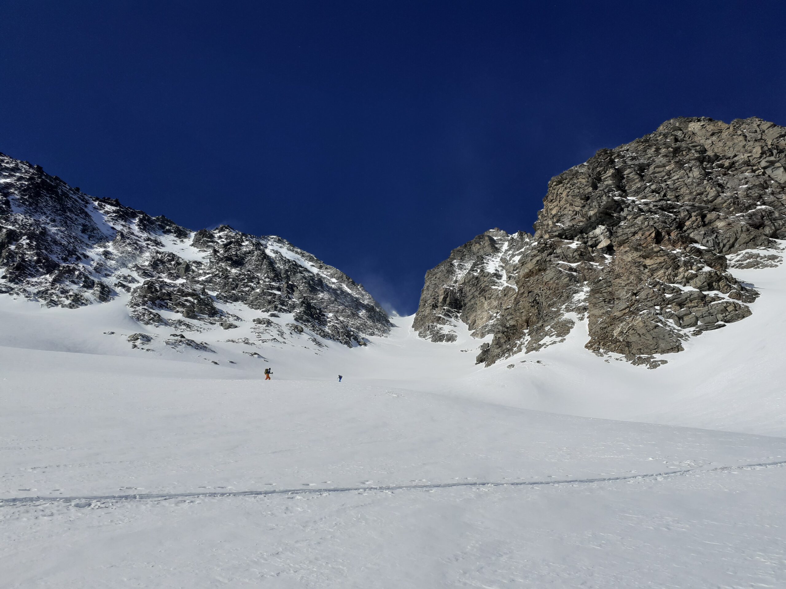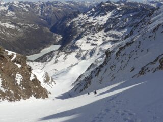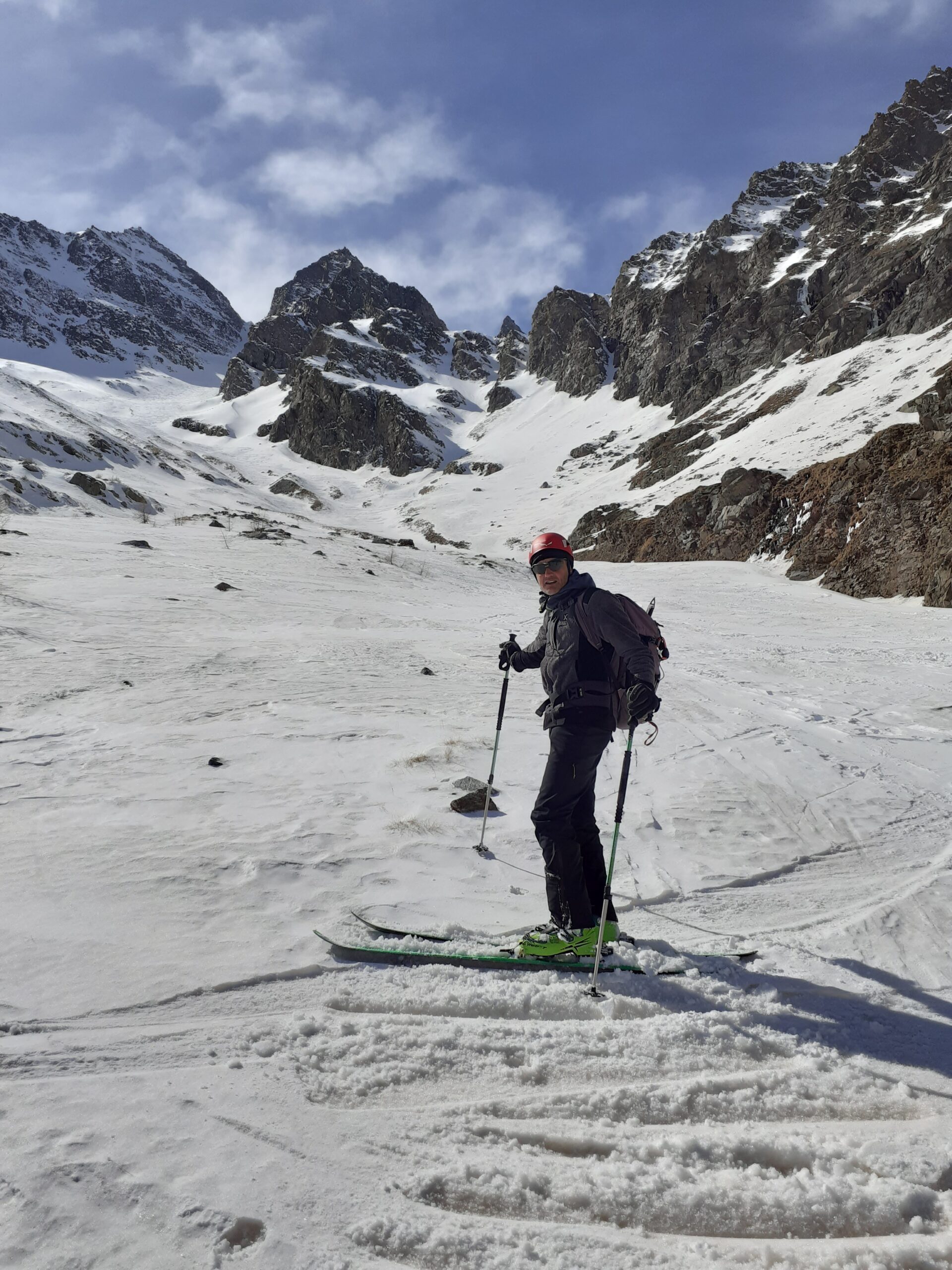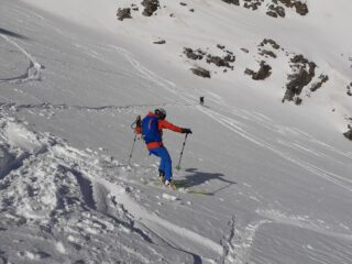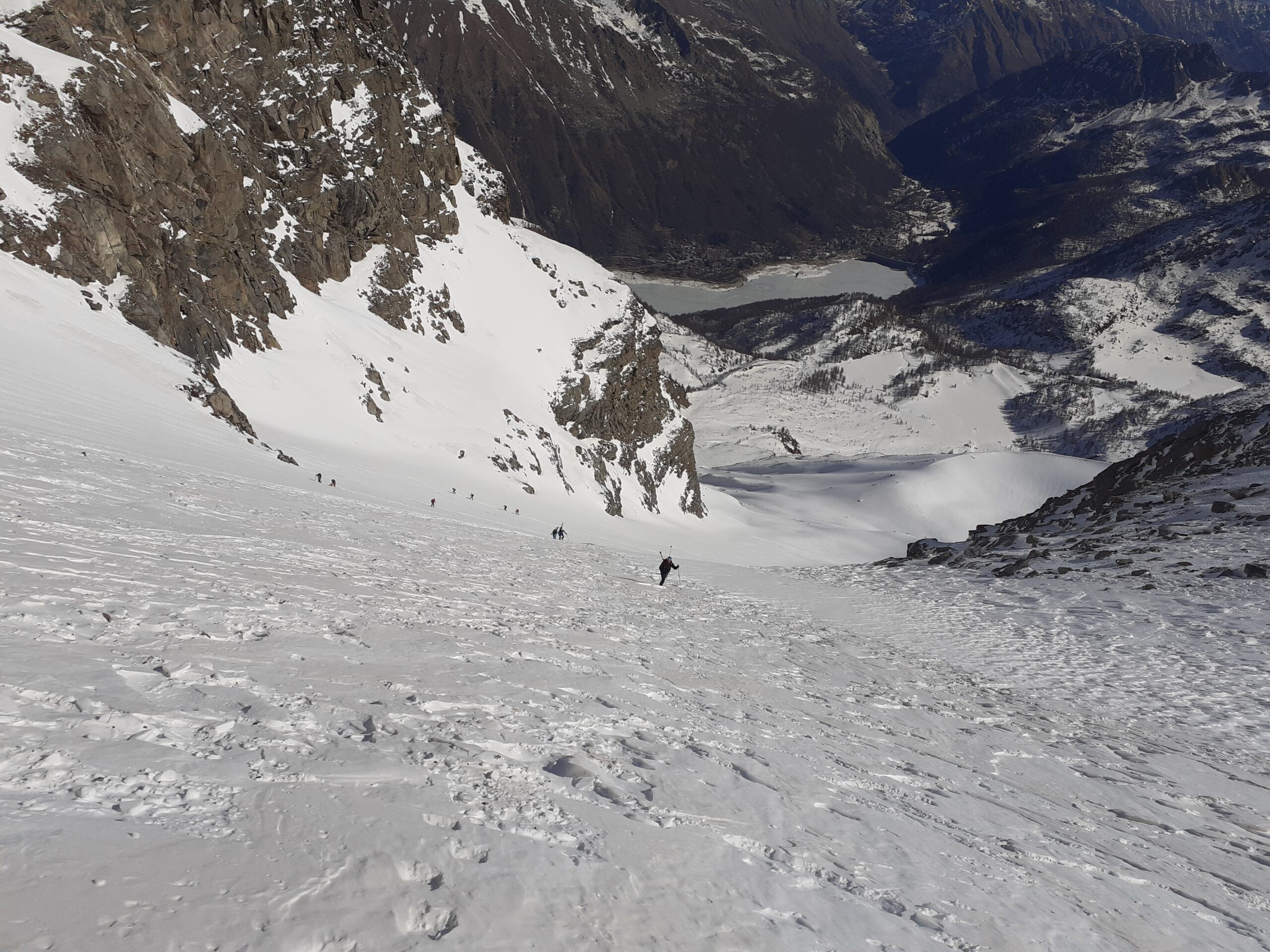 Condizioni molto buone per quella che può essere considerata la gita simbolo della Valle dell’Orco. Partiti alle 6.20 con gli sci in spalla e salendo il sentiero nel bosco con i ramponi per la diffusa presenza di ghiaccio. A quota 1.850 abbiamo scalzato gli sci. Occasionali raffiche di vento gelido non ci hanno disturbato troppo. Appena si affronta lo spettacolare e diretto pendio del Colle Perduto Perduto è consigliabile usare i rampant in quanto è presente neve molto leggera e scivolosa portata dal vento, capace di cancellare in pochi minuti ogni traccia. Poco prima di quota 3.000 la salita si fa sempre più ripida e si sale con ramponi e piccozza. Pendenza media sicuramente superiore ai 35 gradi. Tratti gelati si alternano ad altri dove il manto nevoso è più cedevole. Aria fredda sul colle e prime curve adrenaliniche su neve farinosa stupenda da sciare, saltando come sognato tante volte in un un’ambiente spettacolare. La vista sul lago ghiacciato di Ceresole è un monito per non sbagliare e rimanere concentrati. Non bisogna farsi prendere dall’entusiasmo e ricordare sempre che al colle Perduto non si può cadere. Scendendo la pendenza si riduce pur rimanendo sostenuta. Da quota 2.300 in poi il manto si fa primaverile anche se, a causa del vento e del freddo, non ancora trasformato. Un po’ difficoltoso il rientro nel bosco a causa del permanere del ghiaccio sul sentiero. Un altro “gitone imperiale” con Luca e Matteo e altri amici del CAI Chivasso.
