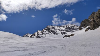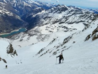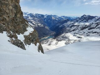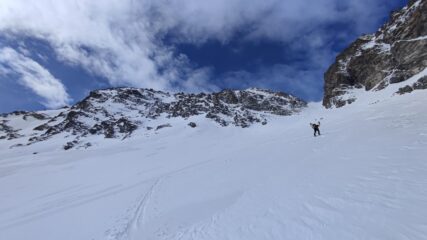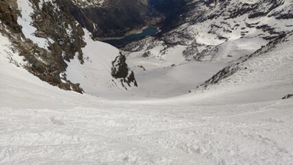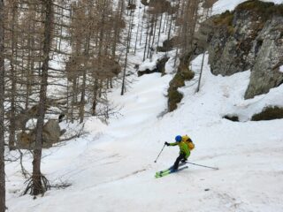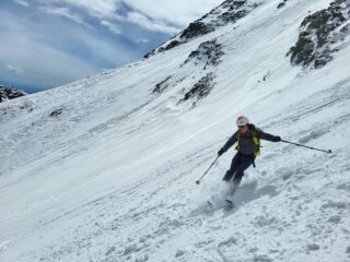 Prima parte di canale con pendenze sostenute su farina compatta su fondo duro un po’ rotta dai vari passaggi ma che ha permesso una sciata divertente e non impegnativa.