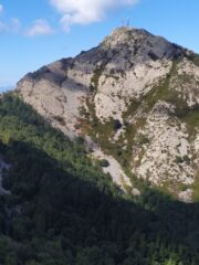 Seguitando sul sentiero, superato una altro bivio con palina di segnalazione si continua sempre su traccia ripida sino a sbucare su una strada sterrata che si percorre nel senso della salita sino ad arrivare ad un ulteriore bivio che con un scalinata iniziale conduce al sentiero che in breve porta in cima al monte Perone.