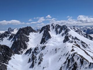 Nel canale sciando a destra faccia a valle fondo più regolare che in mezzo, con qualche centimetro di farina sopra. Giù nel vallone neve perfetta per una sciata velocissima. Bellissima gita
