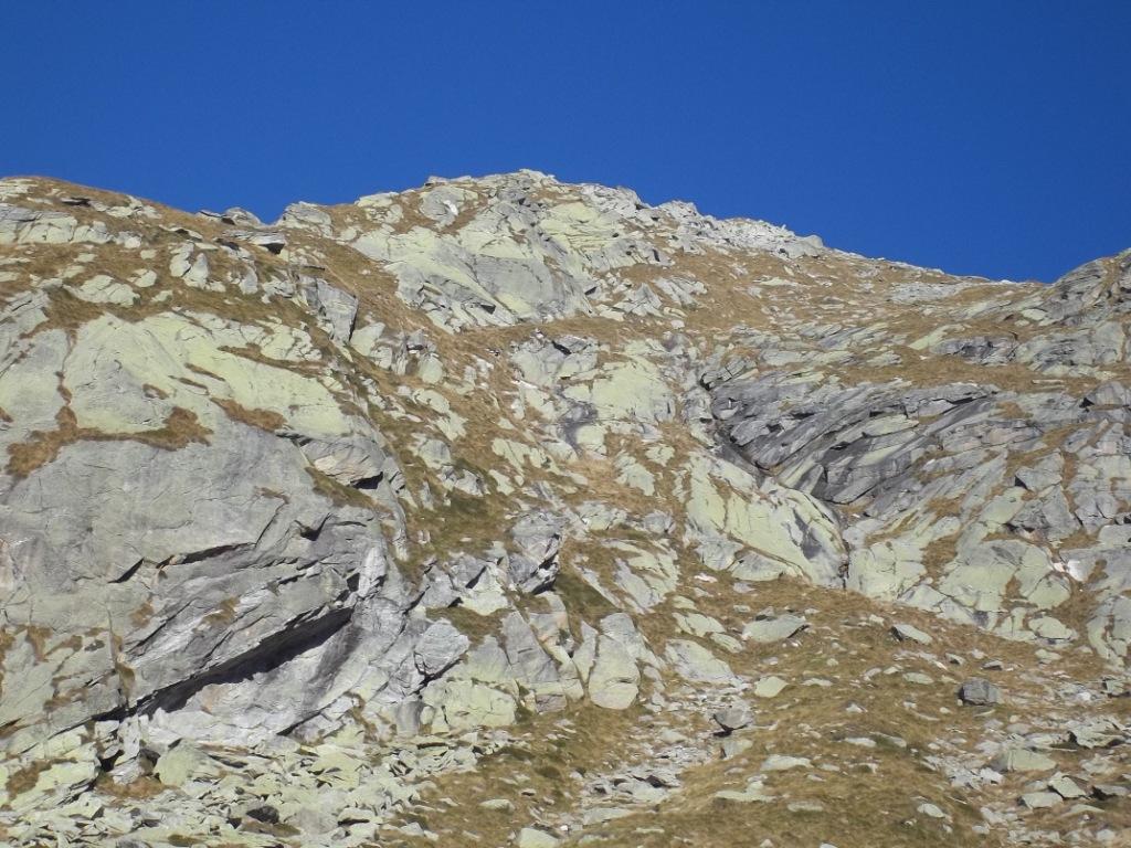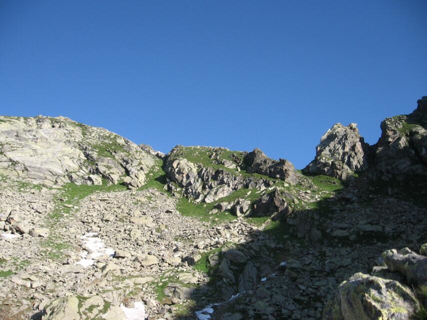 Qui è conveniente fermarsi un attimo a studiare il percorso di salita. Non è infatti conveniente dirigersi verso il canalino erboso che conduce alla Bocchetta della Perra (molto evidente a sinistra di un grosso gendarme roccioso) ma è meglio imboccare la striscia erbosa (anch’essa di qui ben visibile) che sale più o meno parallela un po’ più a sinistra. La si percorre completamente con procedere assai faticoso su pendio ripido di erba scivolosa specialmente se umida.