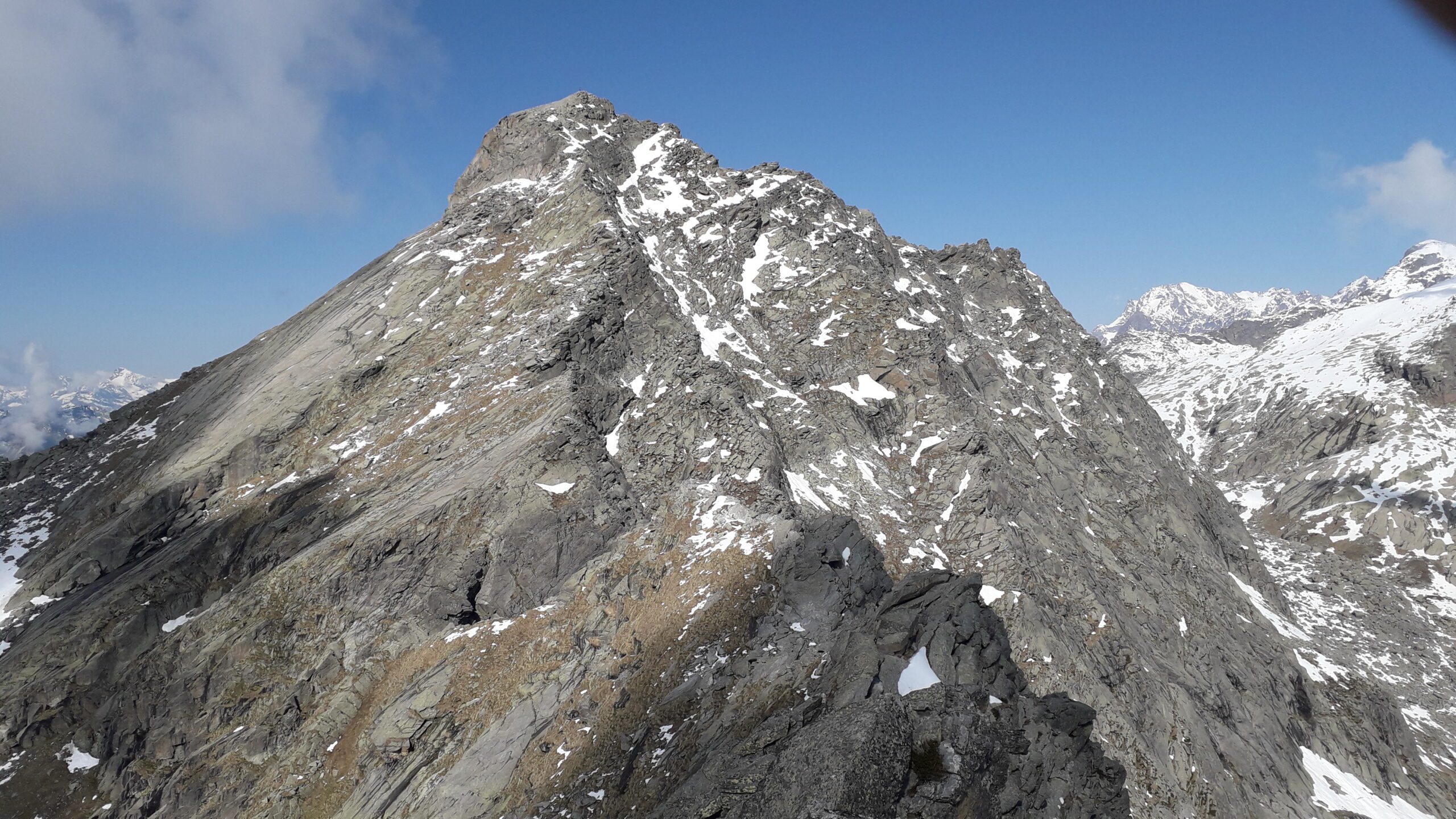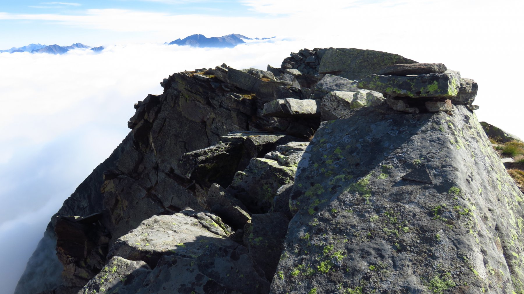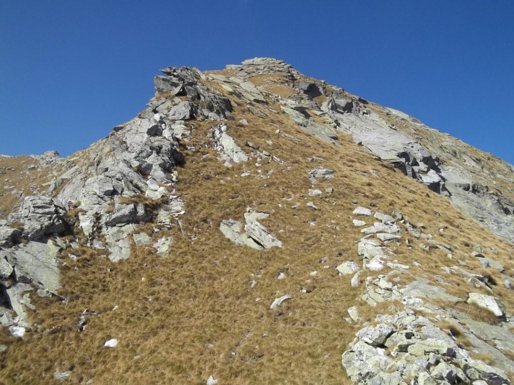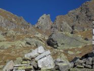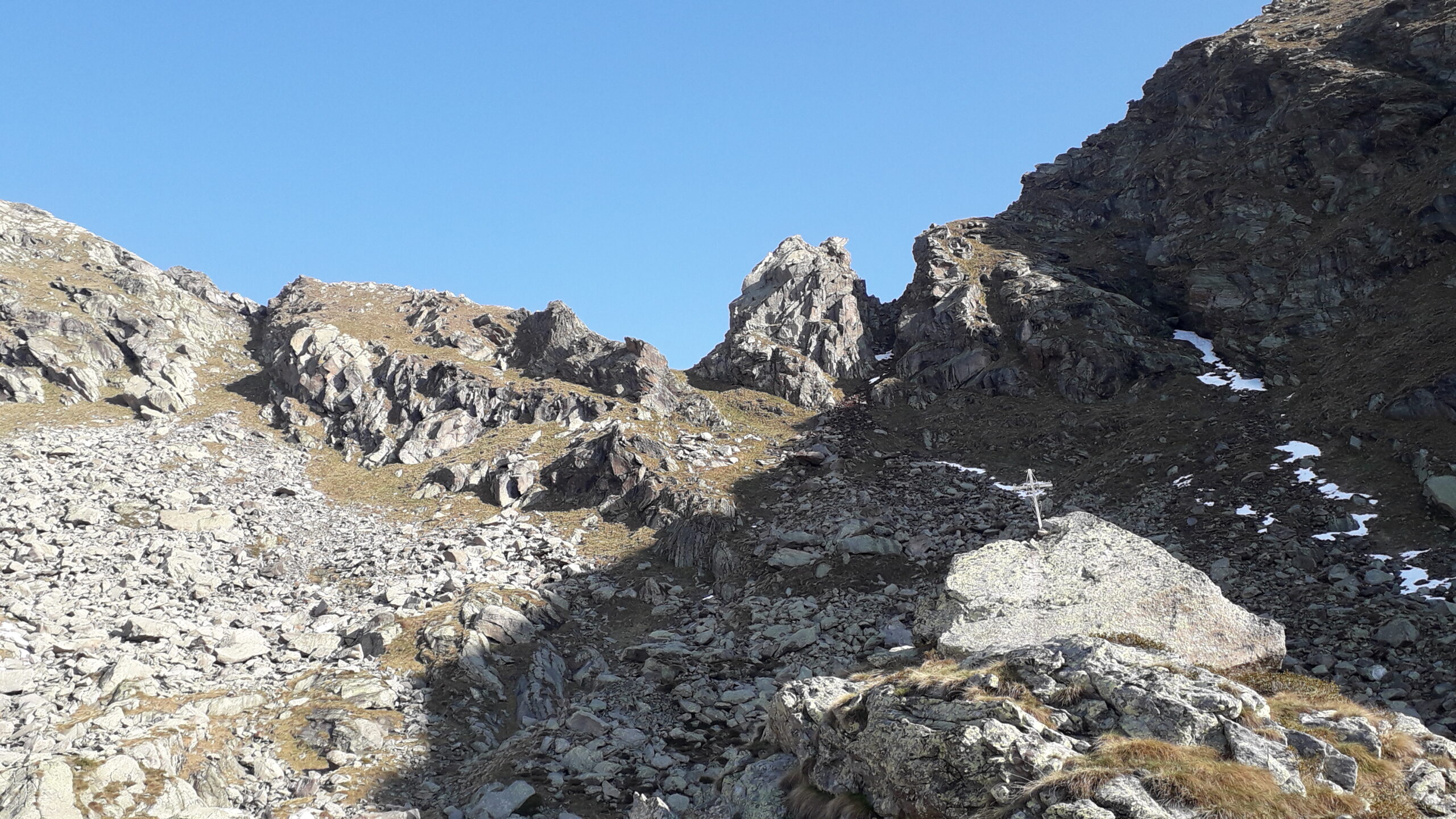 Risalendo quest’ultimo costone si arriva in poco tempo a un rudere 2270 m, lo si supera e continuando nella stessa direzione fra erba e massi si raggiunge una bella conca spesso nevosa 2385 m dove su una piccola elevazione è posizionata una crocetta metallica con la scritta “ALDO”.