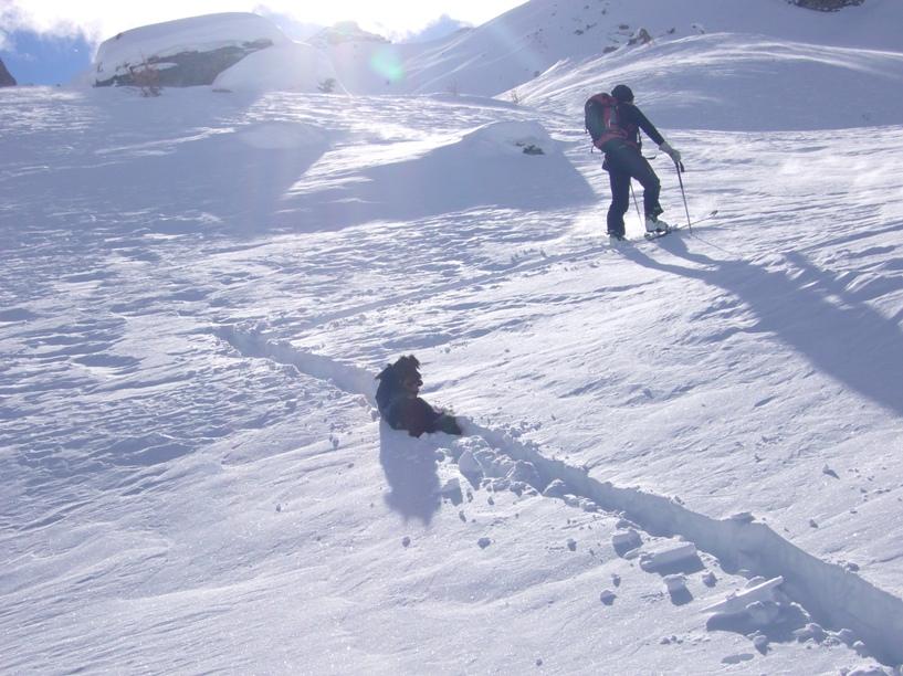 Siamo saliti sul sentiero estivo fino al Crest.Poi lungo il torrentino Cuneaz. Tanta neve fino al colle, tutta da battere.