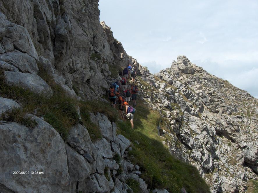 Si procede lungo lo spartiacque (segnavia rossi) con brevi saliscendi, superando boschetti di pini e facili tratti rocciosi. Si traversa per un tratto sul versante sud poi si torna sullo spartiacque raggiungendo la cima della Rocca Ferà 2221 m. Si scende brevemente lungo la cresta e si giunge in corrispondenza di due torrioni (Torrione Mader a ovest e Dente Mader a est, separati da un piccolo intaglio). Il Dente Mader si può salire sulla parete sud, poco a destra dell’intaglio (6-7 m. di III, III+ con 1 passo di IV; 1 chiodo e cordino sulla cima). Il Torrione Mader, da questo versante è molto rotto, per cui conviene proseguire, aggirando i due torrioni a nord, sfruttando piccole cenge attrezzate con cavi d’acciaio.