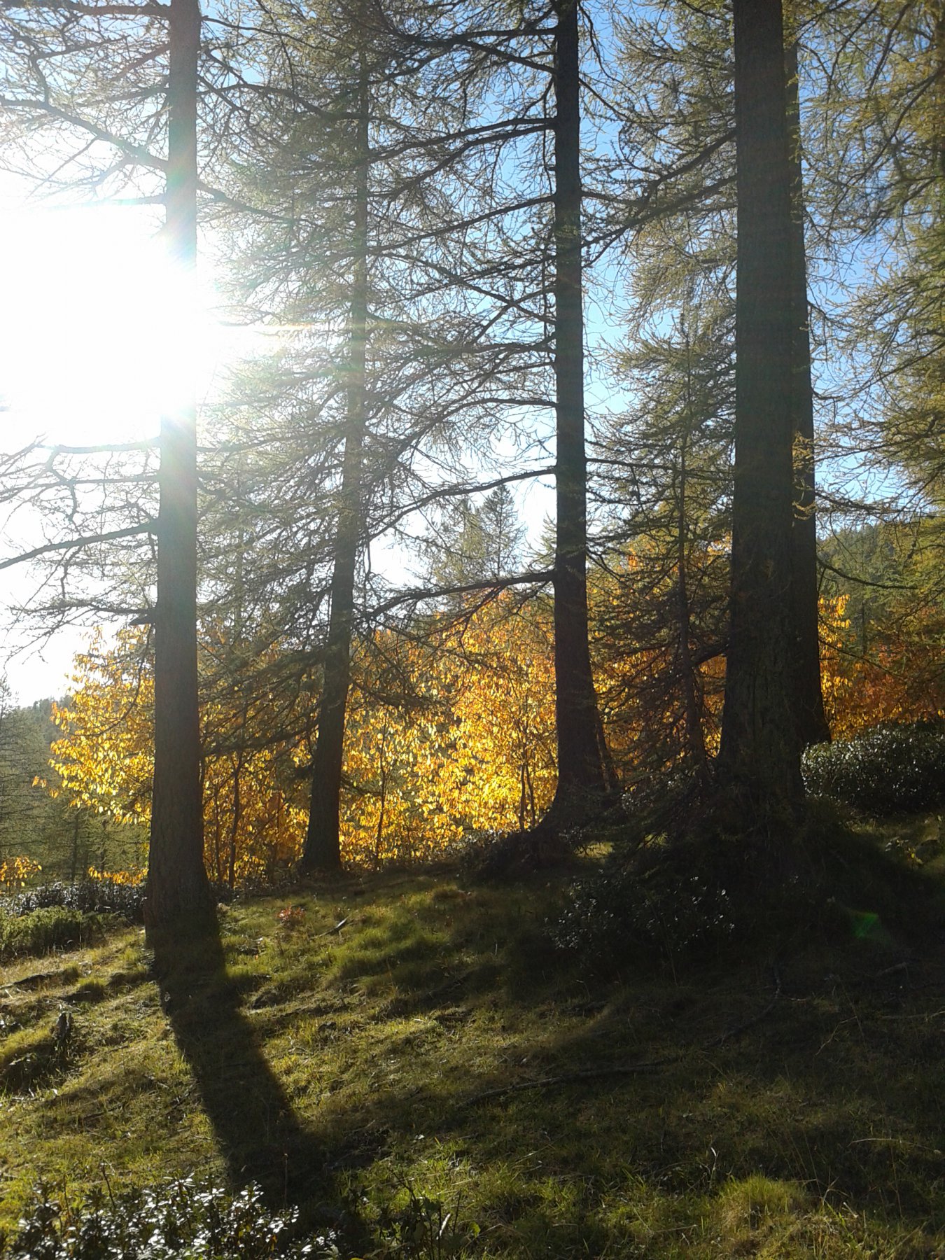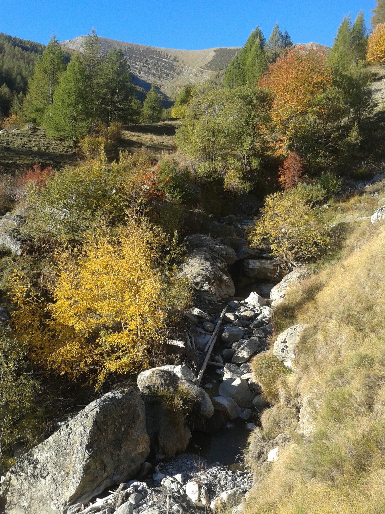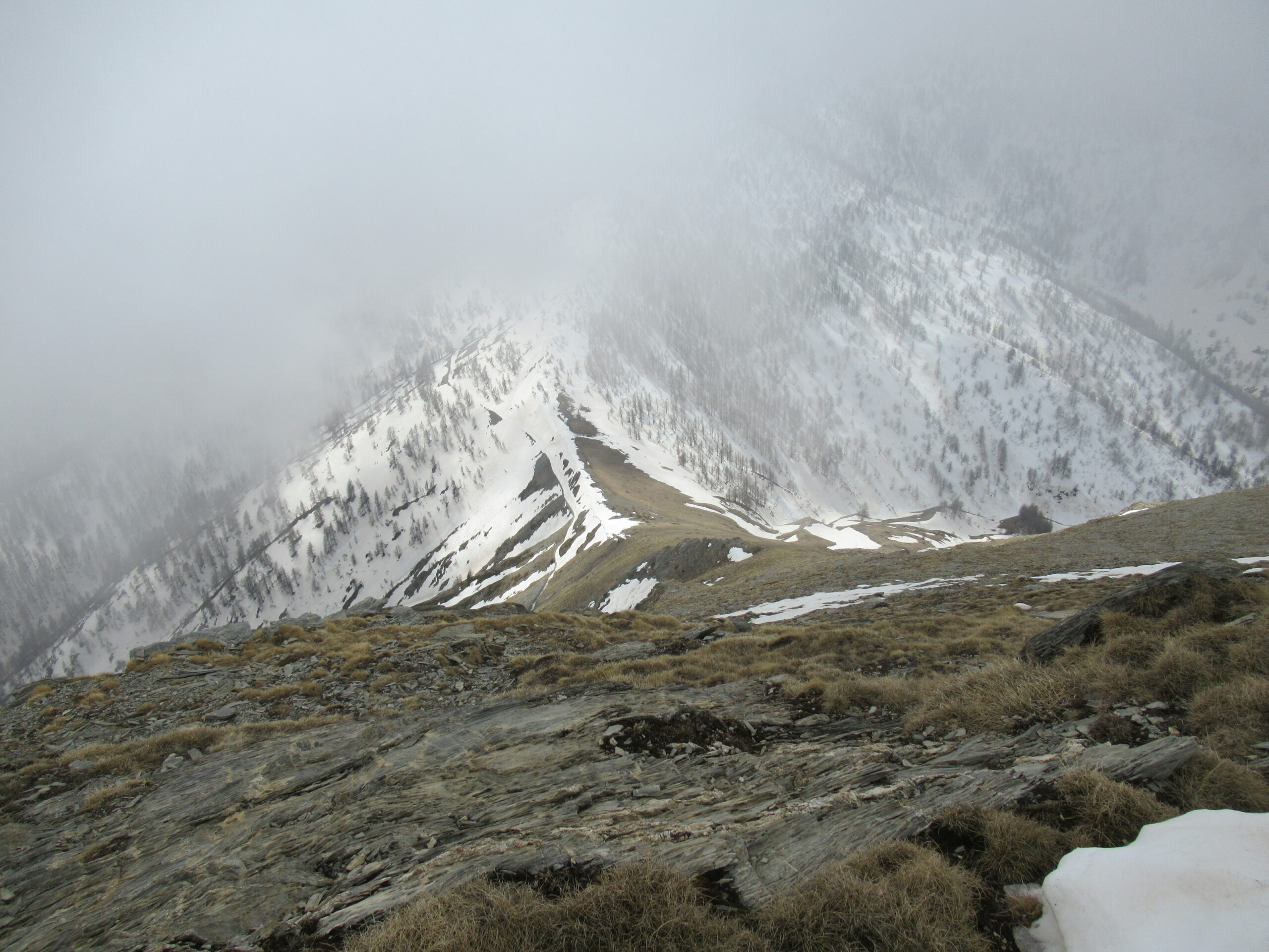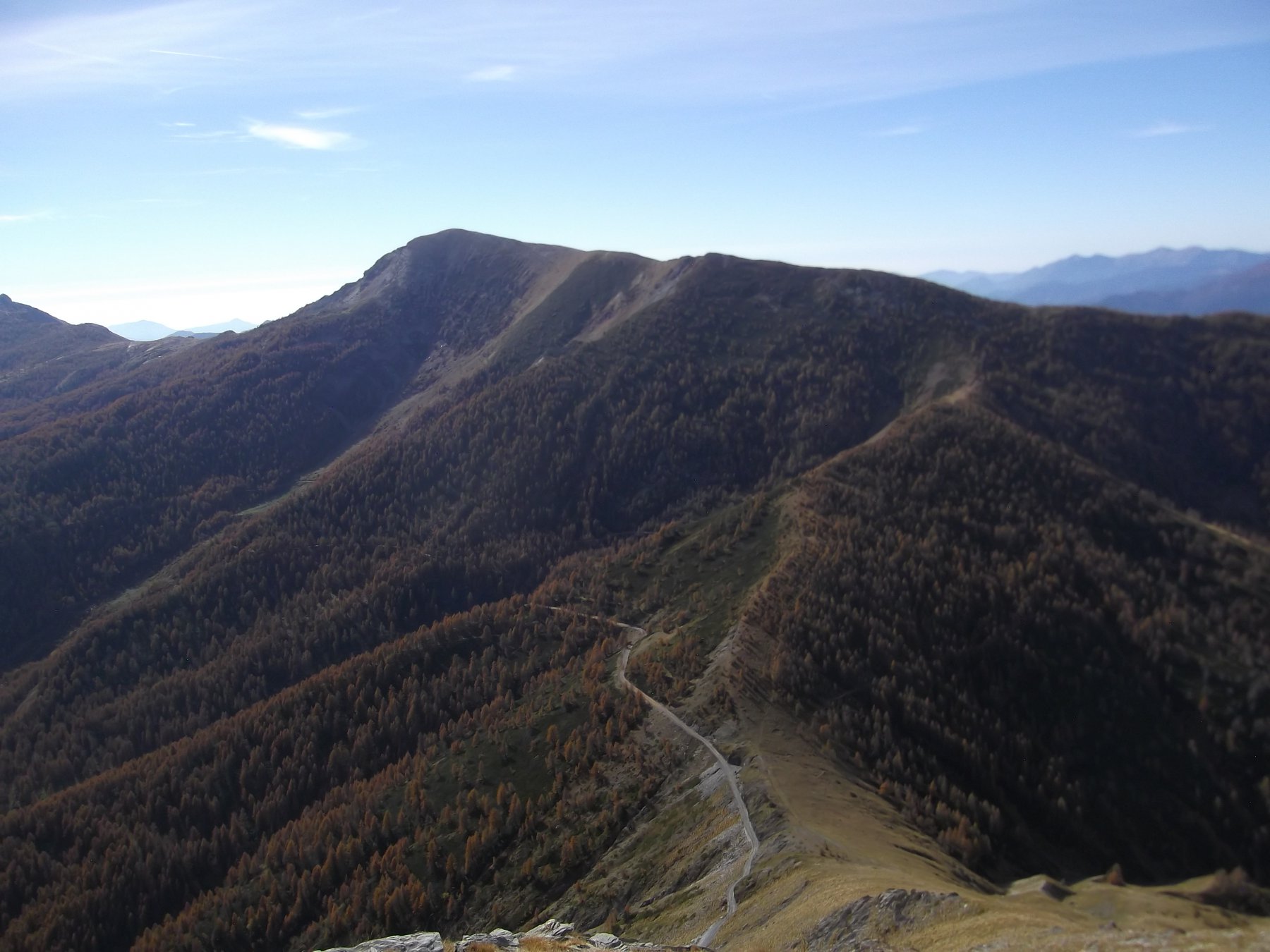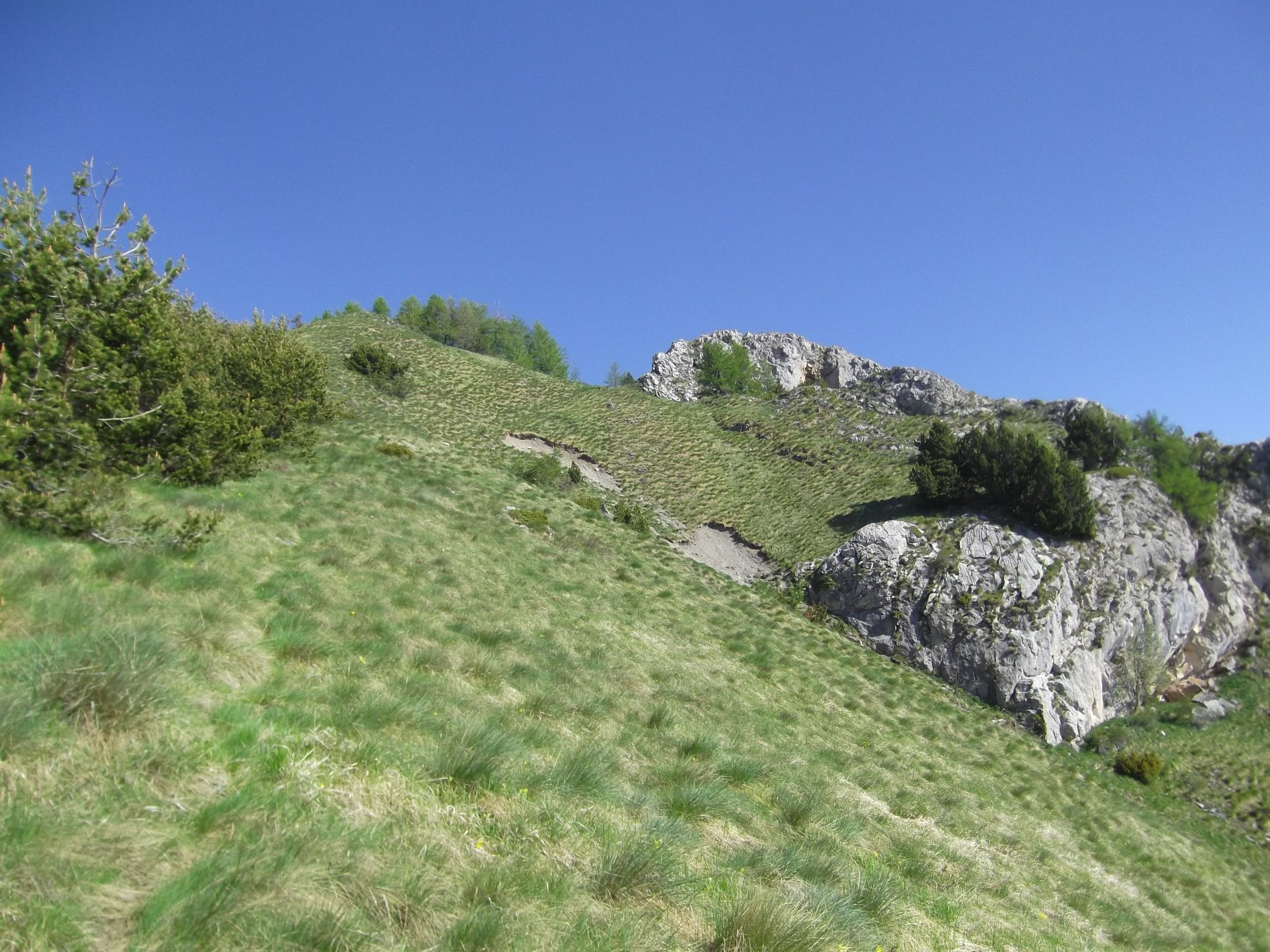 Discesa: dalla vetta si scende, senza traccia, lungo il versante sud-ovest, fino al Colle delle selle Vecchie (2098 m.), con percorso a piacere su terreno ripido ma abbastanza facile e ben terrazzato. Dal colle si scende alla strada sottostante, che si percorre in direzione sud (discesa) per poche centinaia di metri. Raggiunto un albero con cartelli (non il primo, ma il secondo, poco prima che la strada esca dal bosco per percorrere un lungo tratto assolato,) si nota a sinistra una traccia di sentiero che scende nel lariceto, percorrendo un evidente costone in direzione est. Il sentiero intuibile anche se ricoperto da aghi di larice, è segnato sugli alberi con vecchi bolli gialli ormai poco visibili. Ad un certo punto si tralasciano i segni gialli che proseguono diritti su terreno coperto da vegetazione, e si segue la traccia principale che piega decisamente a destra, scendendo in diagonale verso sud fino ad una bella radura dove si attraversa un ruscello. Da qui si procede seguendo la traccia di sentiero, poco evidente ma segnato con ometti sparsi sui cippi tagliati, proseguendo verso sinistra (est) mantenendosi più o meno paralleli al corso d’acqua. Entrati nel bosco a circa 1700 m si incontra un cartello indicatore, qui il sentiero torna evidente e scende nel lariceto e poi per un prato, fino a trovare nuovamente il torrente che si deve attraversare, raggiungendo le case Nivorina 1600 m circa.