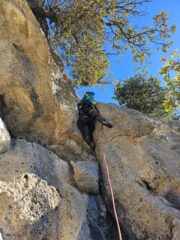 – 1° tiro: obliqua a destra fino ad una sosta su fittoni: questa sosta è ignorata nella relazione qui e sulla guida di Thomas, ma non su quella di “Finale Climbing”, dove è presente un “tiro 2” che arriva al terrazzino dove si sosta su albero o radice;