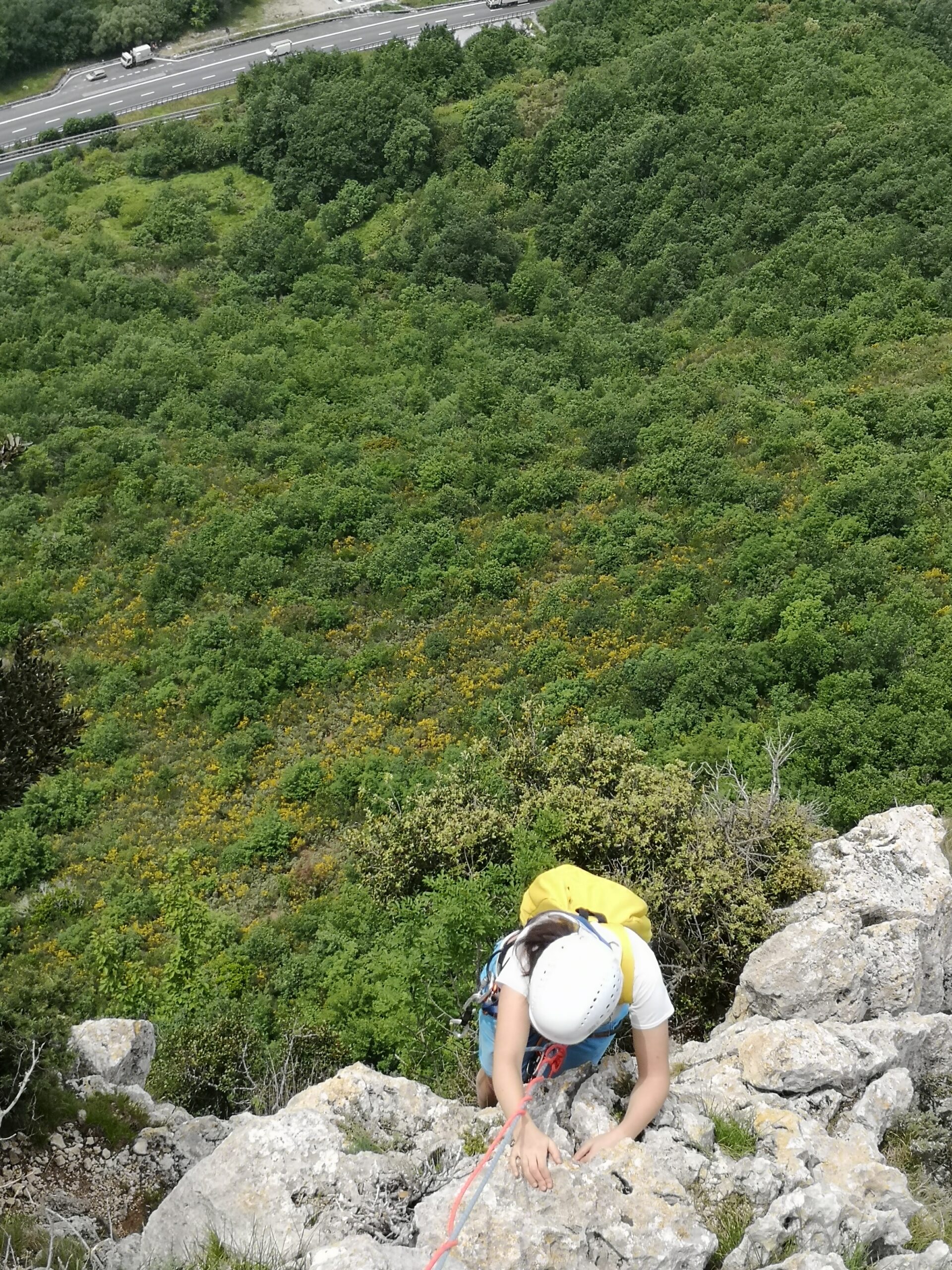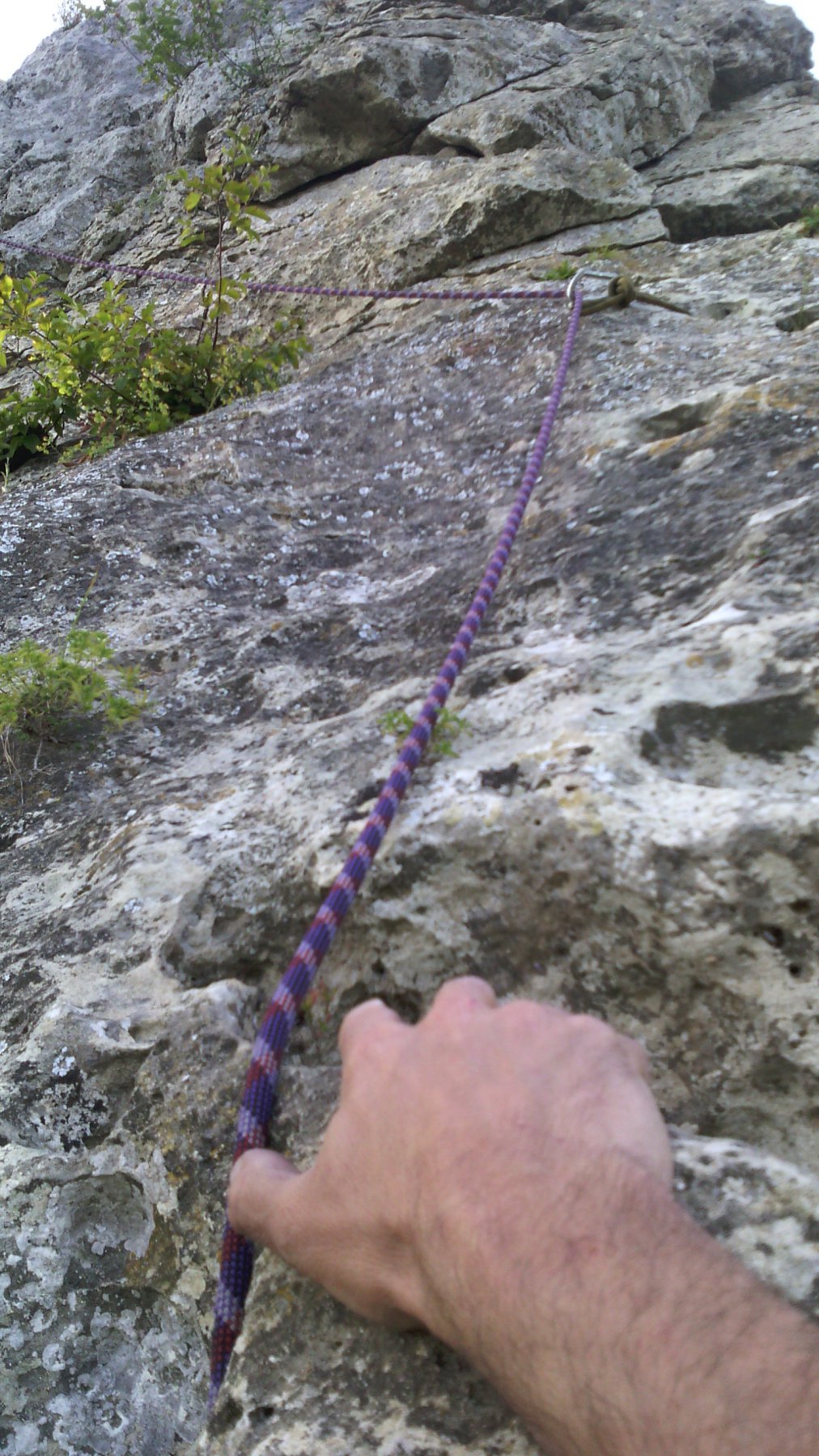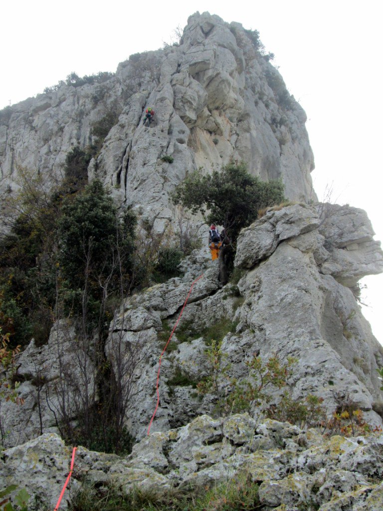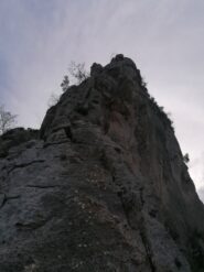 Si segue il sentiero che passa dietro la fontana e che sale in direzione della paret. Si segue il sentiero di dx che ripido porta ad aggirare la parete e che apre la vista sull’autostrada. proprio nella curva a gomido dove incomincia il piano, parte la via che segue la logicità dello spigolo. Rari i chiodi /spit, solo un passaggio dove è ben visibile un camino, necssita di attenzione, (3 spit)(3°)