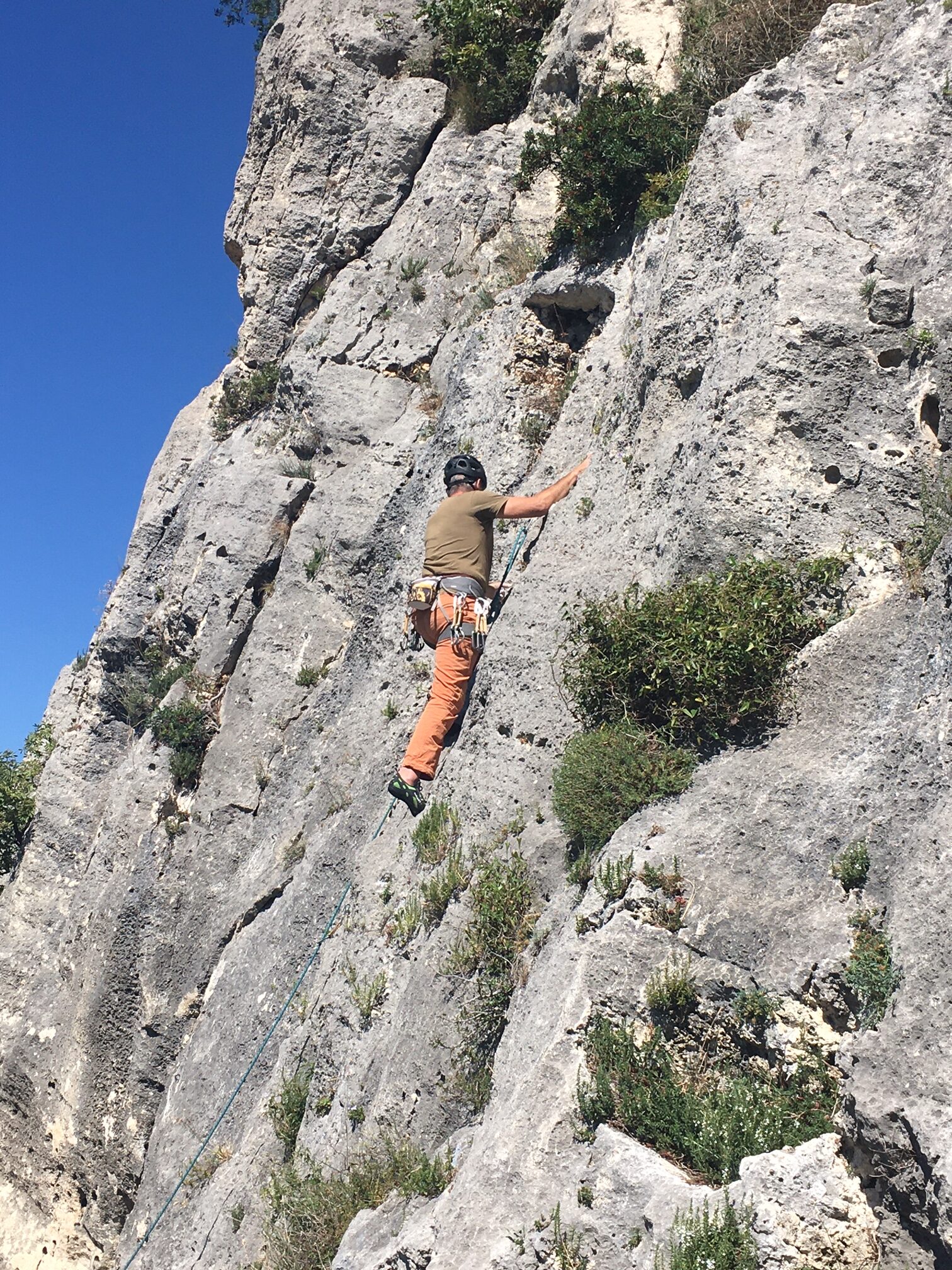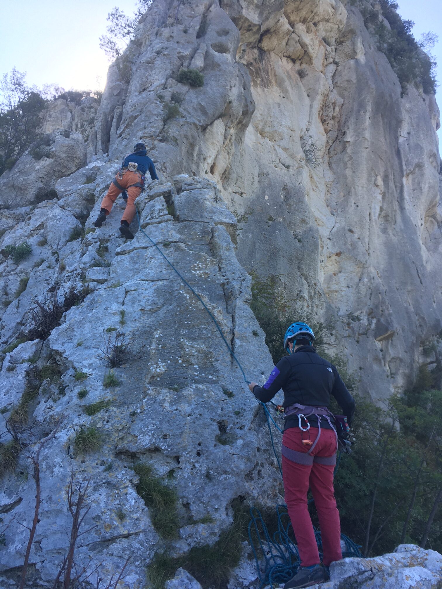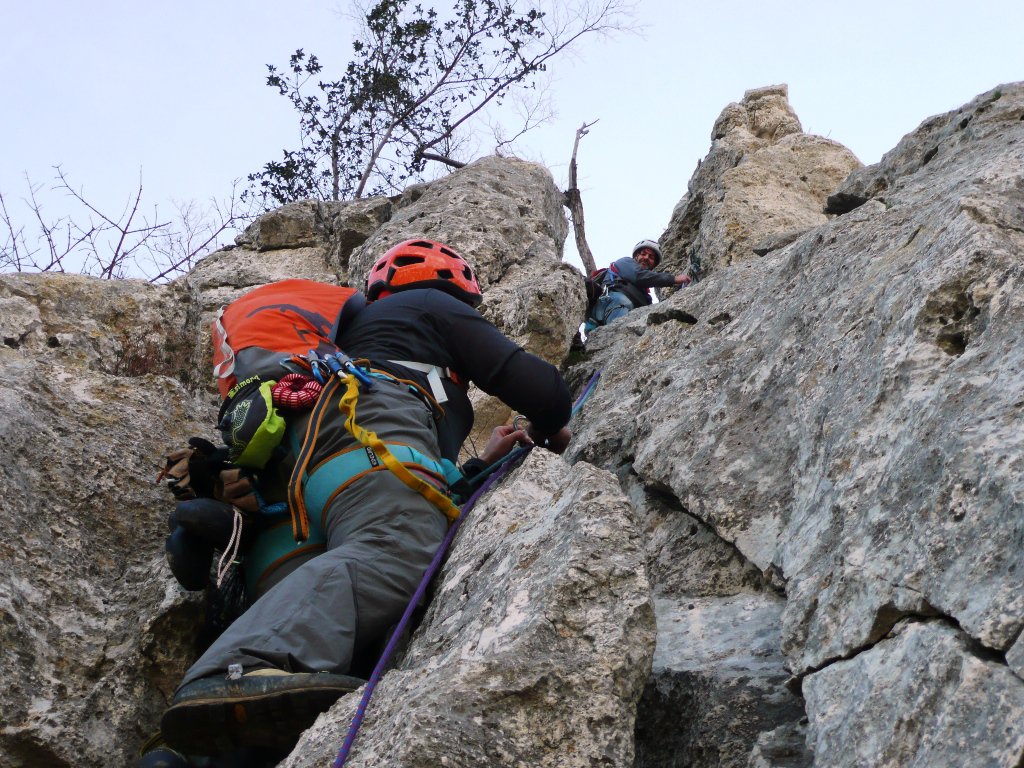 Si segue il sentiero che passa dietro la fontana e che sale in direzione della paret. Si segue il sentiero di dx che ripido porta ad aggirare la parete e che apre la vista sull’autostrada. proprio nella curva a gomido dove incomincia il piano, parte la via che segue la logicità dello spigolo. Rari i chiodi /spit, solo un passaggio dove è ben visibile un camino, necssita di attenzione, (3 spit)(3°)