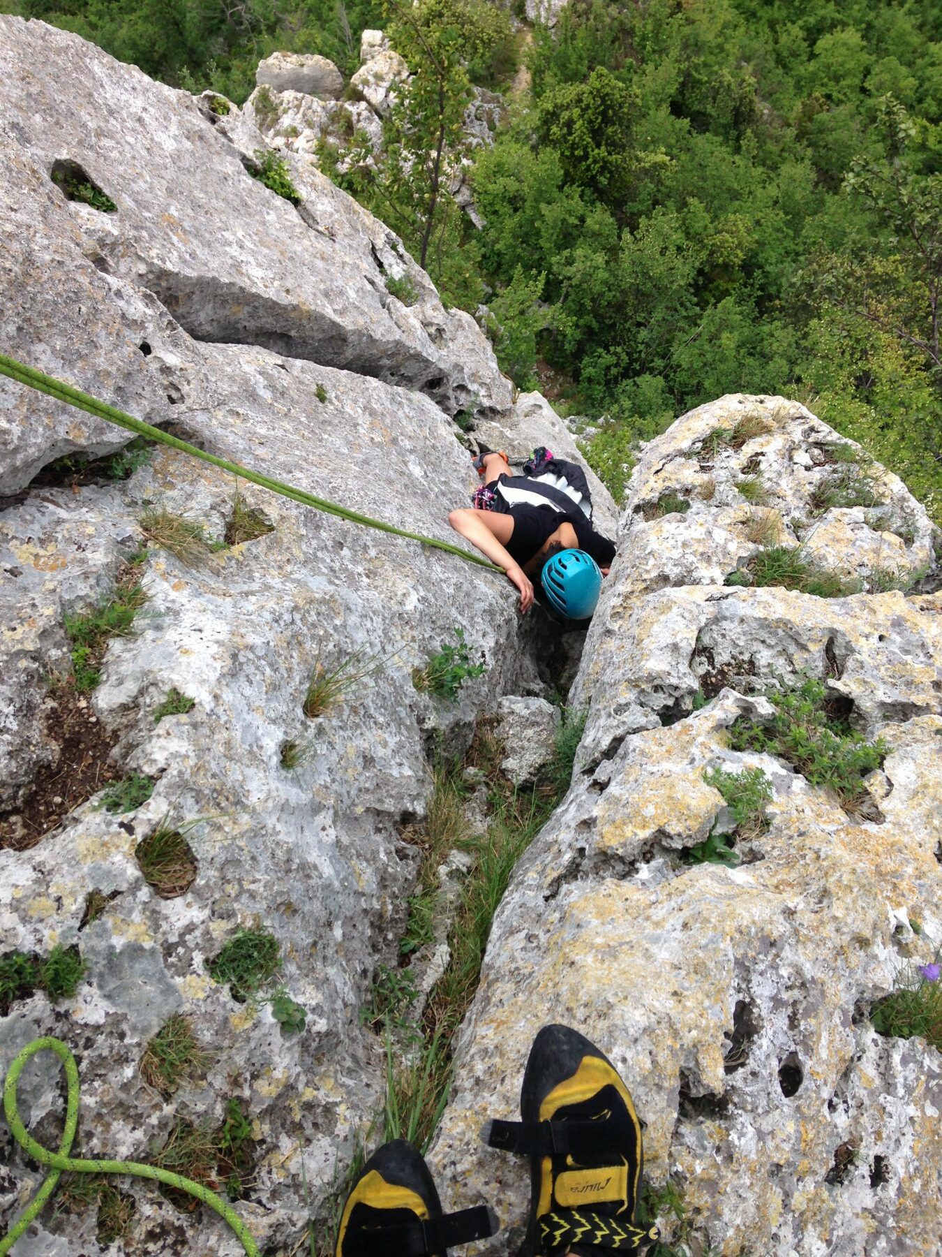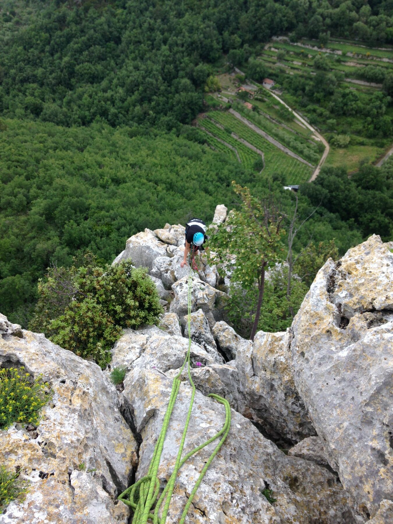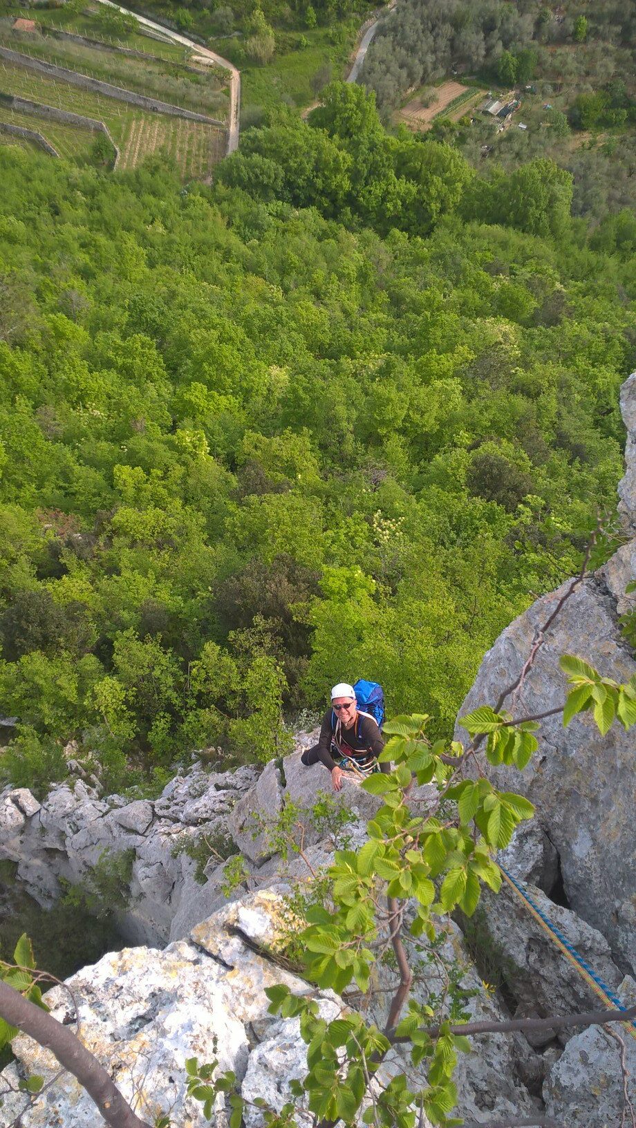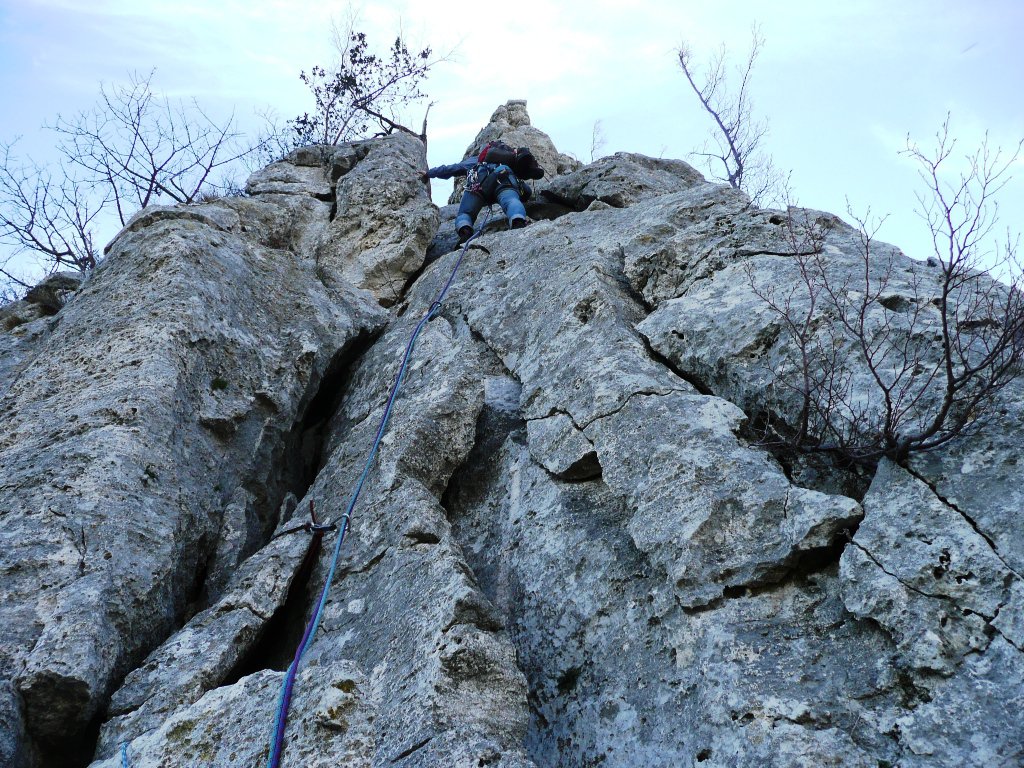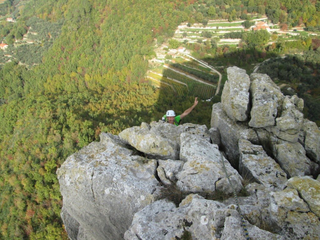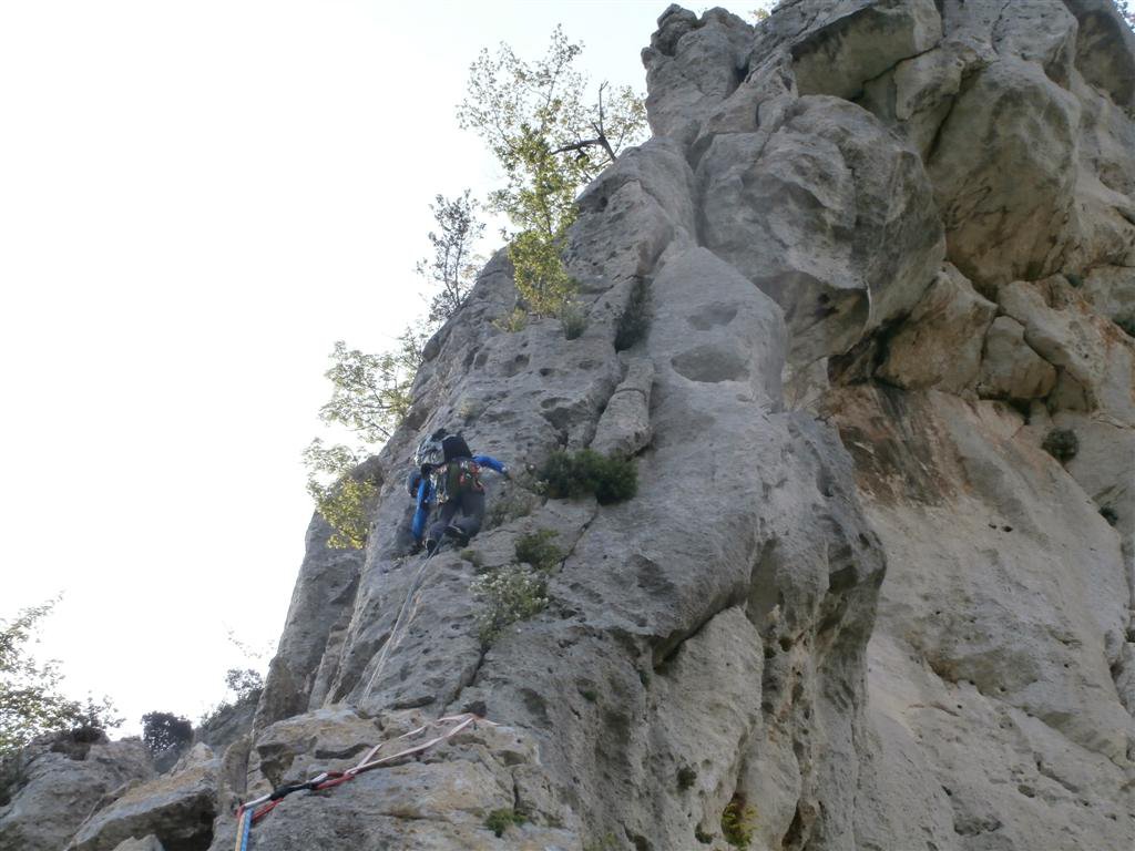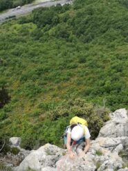 in breve alla sosta. di lì, in pochi minuti si giunge all’uscita della via, e seguendo il sentiero, in breve si raggiunge la croce di vetta.
