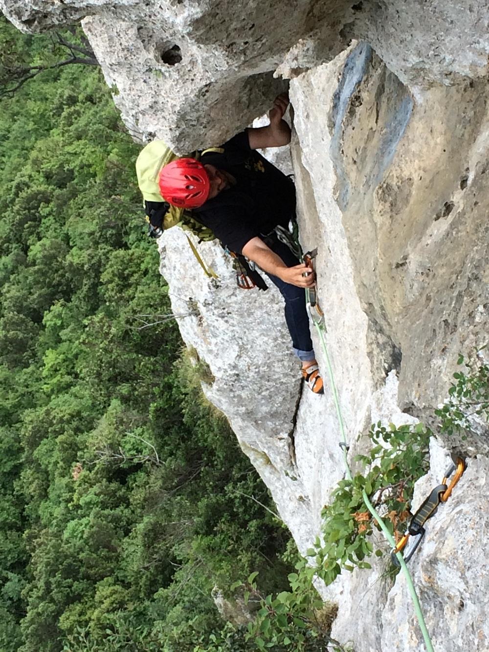 - L4 (30m.) – Ecco il tiro che vale la via. Si raggiunge la fessura verticale con un bel passo atletico e, afferrato il suo margine più sporgente, s’inizia a salire, dopo aver rinviato un primo chiodo posto a sx (V). La fessura si mantiene verticale e sostenuta fino al termine, quando entra in un breve diedro e muore sotto una fascia di rocce strapiombanti (V+ con passo alla Dulfer; lungo chiodo arrugginito all’interno della fessura). Si poggia quindi sulla placca di dx, per raggiungere un chiodo angolare, dal quale s’inizia a traversare, proprio al di sotto della fascia strapiombante, in direzione di un evidente chiodo universale, ben messo ma un po’ inquietante, perché collocato in perpendicolare nell’unico buco al centro di un liscio scudo di roccia (VI/A0). Si raggiunge così una clessidra attrezzata con cordino, da dove si riparte in diagonale (sempre verso dx) per aggirare il margine dello strapiombo, verso un terrazzino alberato (V; 1 chiodo un po’ nascosto); di qui parte un breve canalino piuttosto invaso dalle piante, che conduce in verticale verso l’uscita (III). Se si preferisce recuperare il compagno sorvegliando bene il delicato traverso, conviene attrezzare una sosta sugli alberelli del terrazzino; in alternativa, si può evitare di fare un quinto tiro di pochi metri, attrezzando la sosta al termine del canalino, su solido pilastrino da abbracciare con una fettuccia di generose dimensioni.