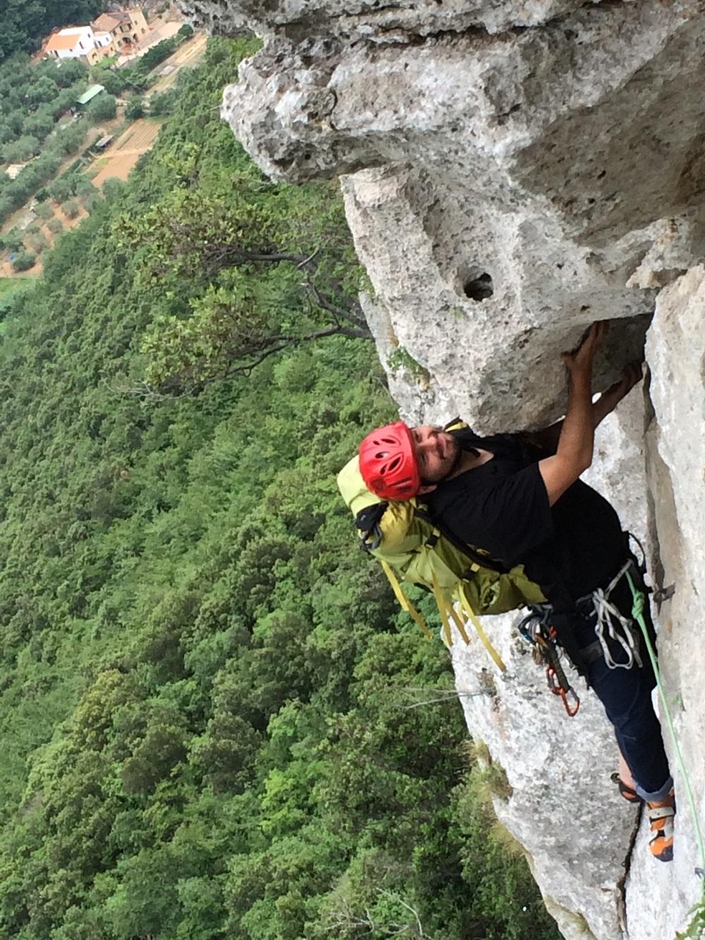 - L2 (15m.) – Il diedro si supera al suo fondo, con un movimento atletico e deciso, dopo aver rinviato un bel chiodo angolare, inizialmente invisibile (V). Raggiunto il soprastante terrazzo, si prosegue sempre verso dx, andando ad attaccare un muretto di roccia ben fessurata (ottimi nuts e friends). Anche in questo caso, si vince il passaggio dopo aver rinviato un bel chiodo angolare, più evidente del precedente. La fessura è abbastanza generosa, ma il muretto è leggermente strapiombante, ragion per cui occorre una combinazione di movimenti piuttosto intensi (V+). Si raggiunge così un secondo terrazzo con un alberello di ginepro, proprio di fronte ad una comoda nicchia (sosta su clessidra attrezzata all’interno della nicchia, con due cordini uniti da 1 maillon).