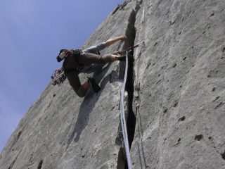 - L2: m 30 * 6 ch. * V, A1 , Salire lungo la fessura a sinistra; quindi verso destra per superare una placca e obliquare a sinistra sino alla sosta sotto una fessura.