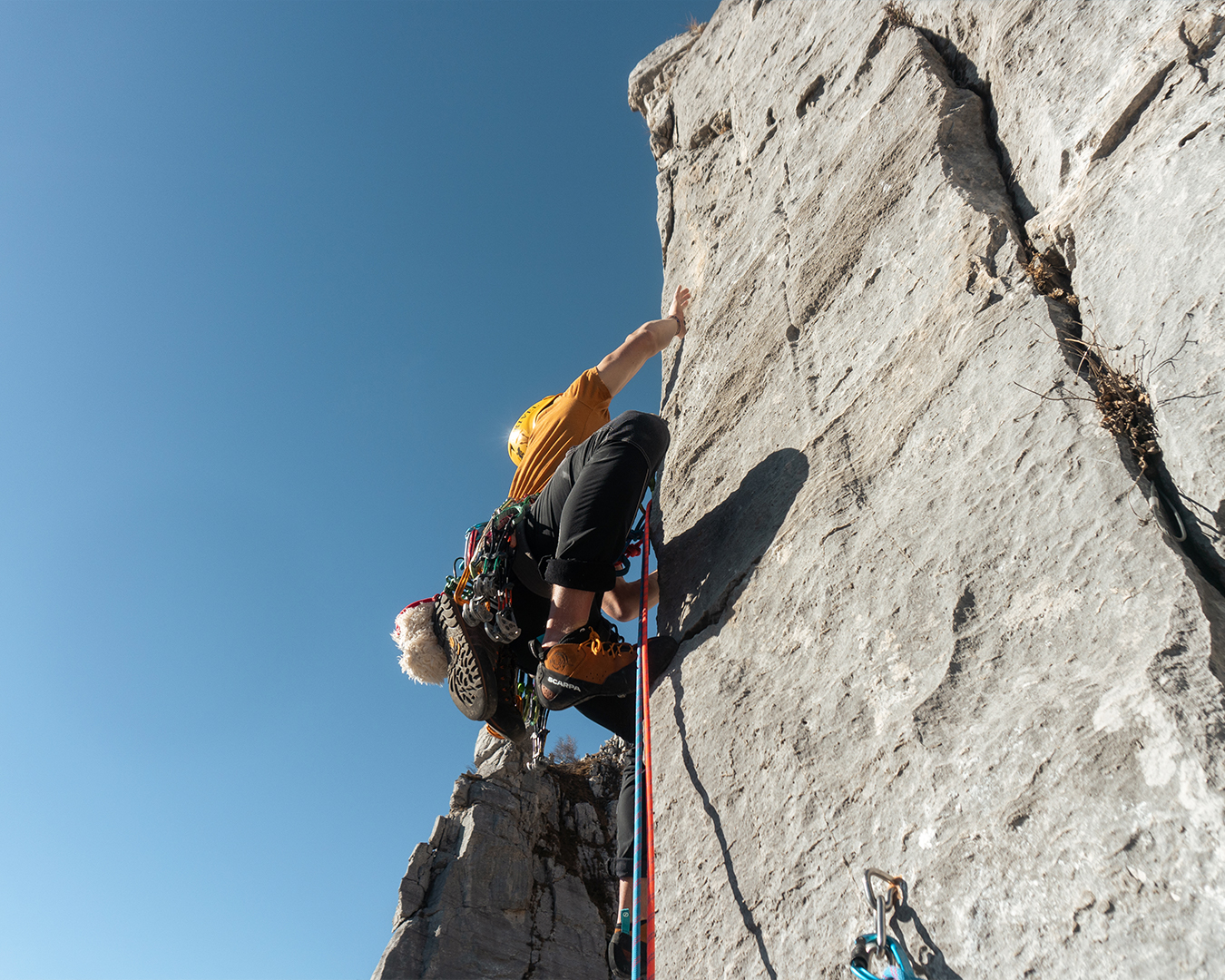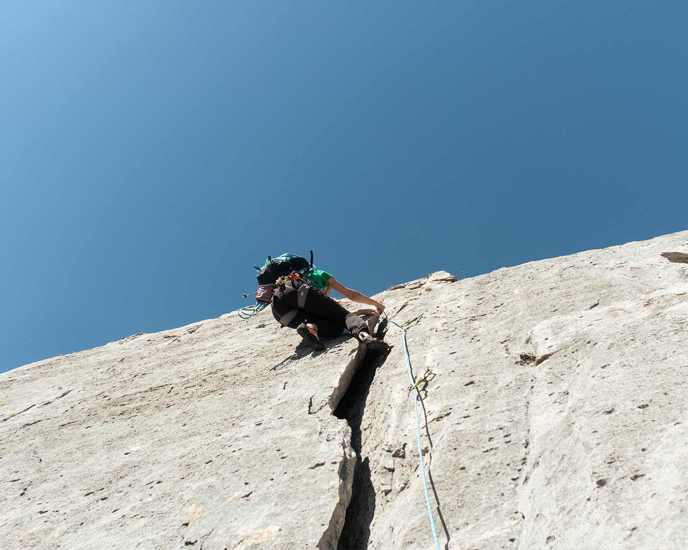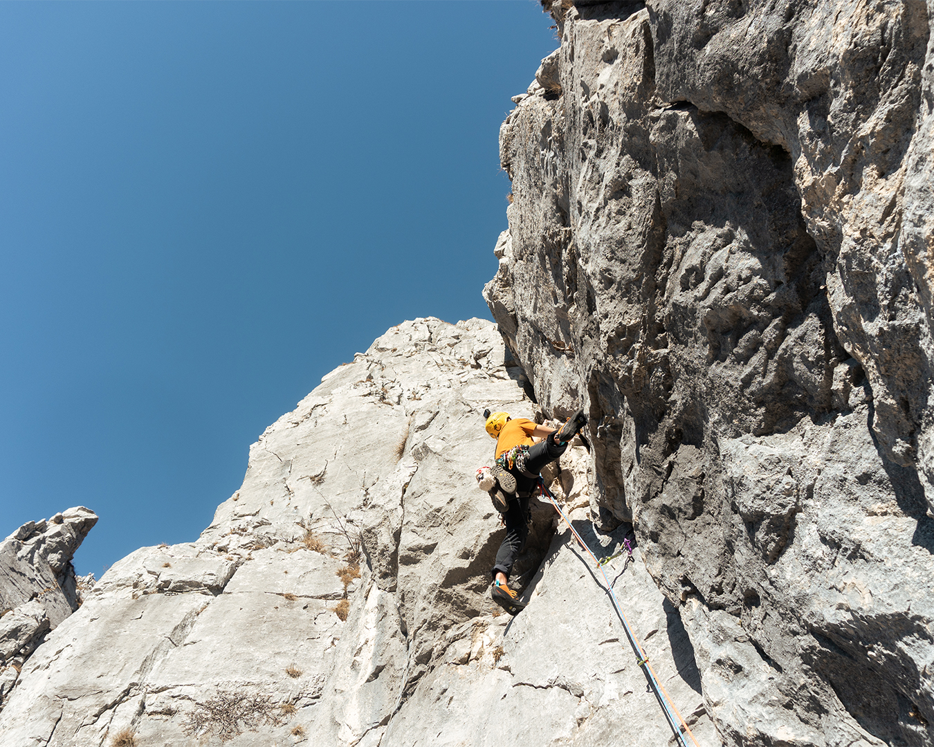 - L3: m 25 * 2 ch. * IV+, VI, III, Innalzarsi lungo la fessura, oltre la quale si entra in un diedrino a sinistra che porta alla sosta.