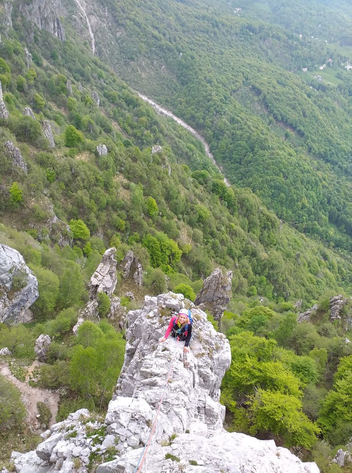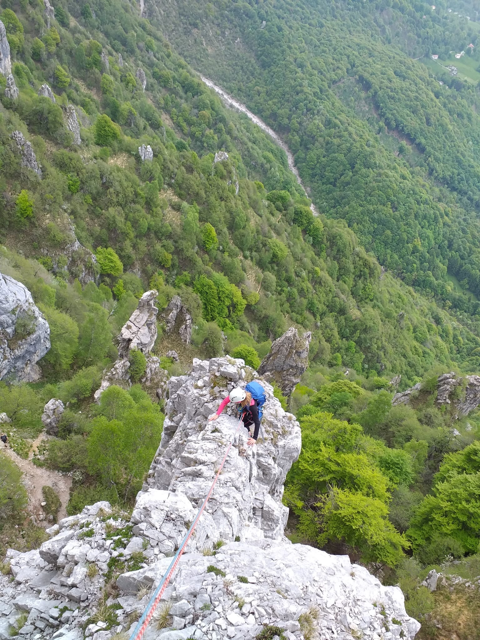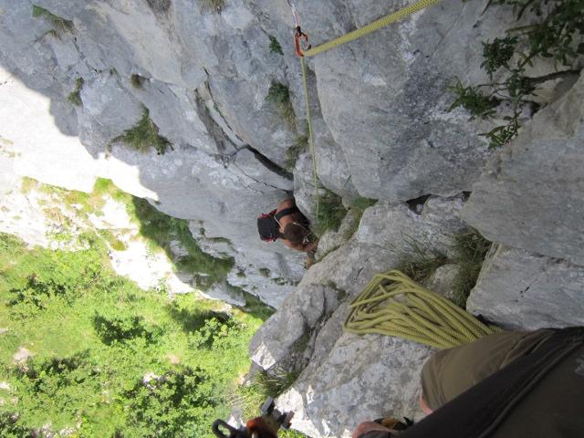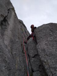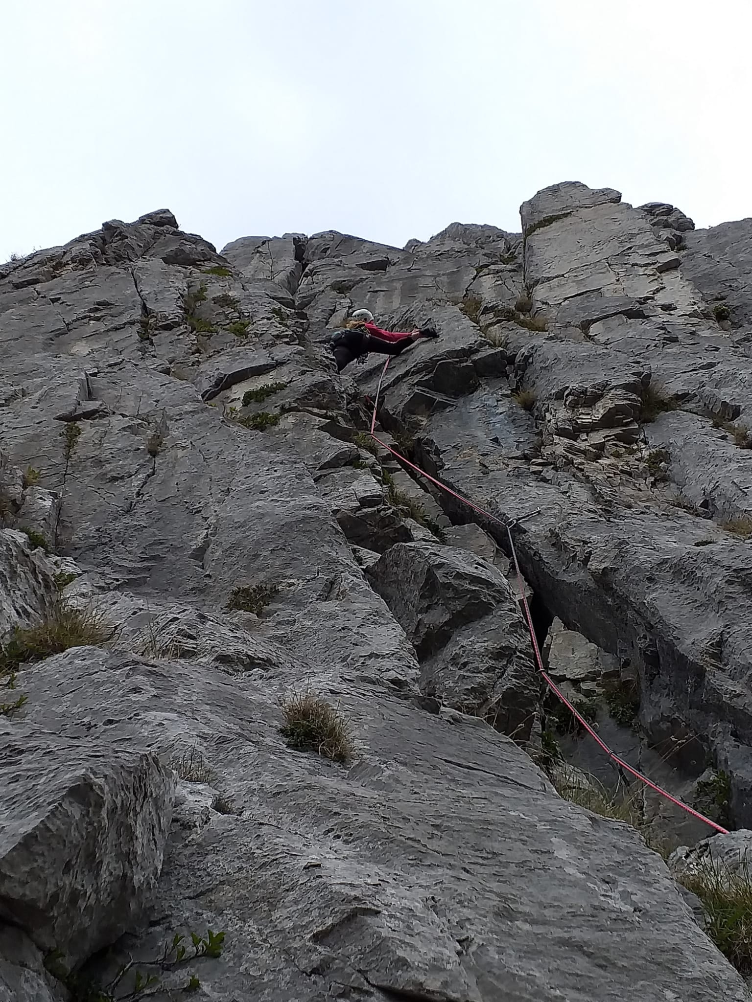- L2 – V, 35mt – I primi metri lungo un diedro, continuare poi leggermente verso sinistra in placca ed uscire verso destra su roccia delicata (la sosta è a destra alla base di un diedro erboso)