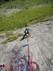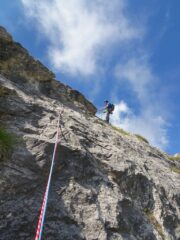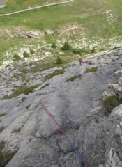 Bella via che percorre la roccia migliore della parete senza ricercare forzatamente le difficoltà. Tutti i tiri meritevoli, l’ottavo sul filo di cresta un vero parco giochi. Chiodatura perfetta, discesa veloce su tracce di sentiero. Con Silvia, oggi solo noi in parete.
