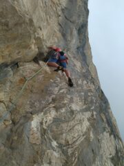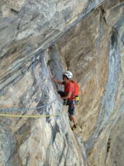 Saliti dalla cava di lorano, le sbarre erano alzate e vetuste quindi siam riusciti a toglierci un bel pezzo di strada. La via è impegnativa, ma la spittatura l’abbiamo trovata buona (l’obbligatorio c’è tutto!) Sul tiro di 7a il crux sta nel trovare la tacchetta buona altrimenti si rischia di esplodere e volare ( provato dalla sottoscritta) il 6c+ seguente è bello tecnico su roccia da urlo! Noi abbiamo usato una serie intera dal 0.1 al 3 con doppi 0.3 e 0.4 .