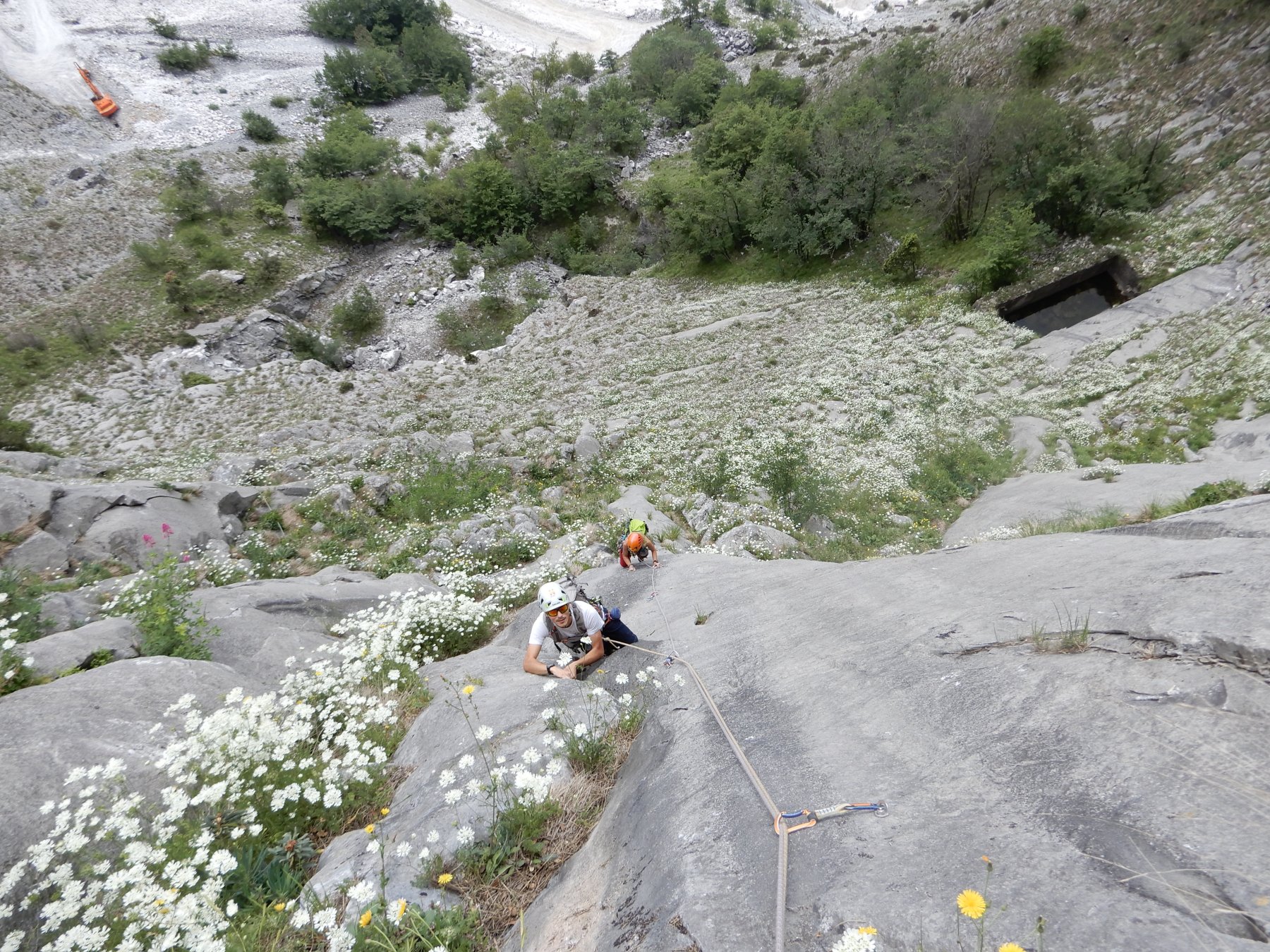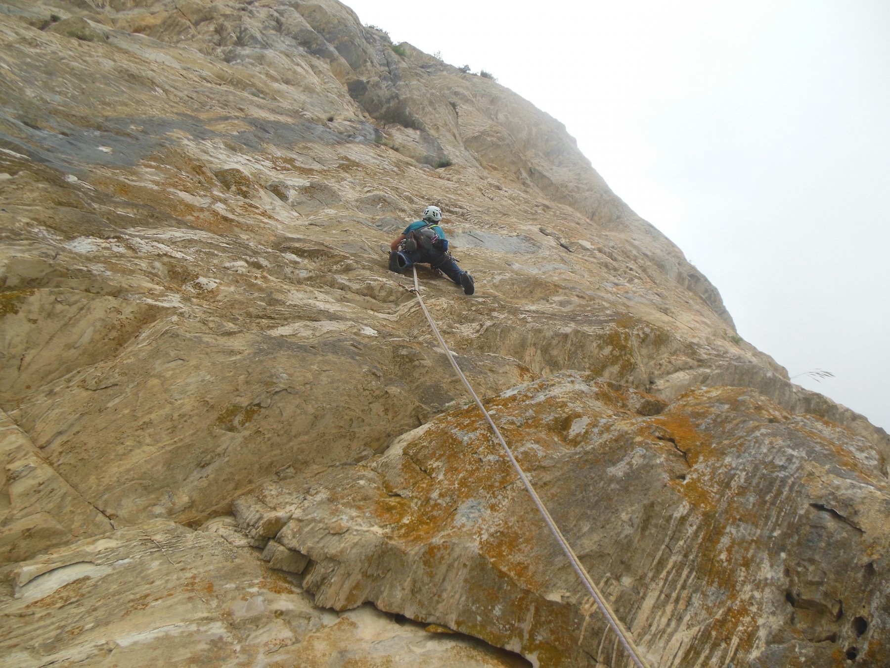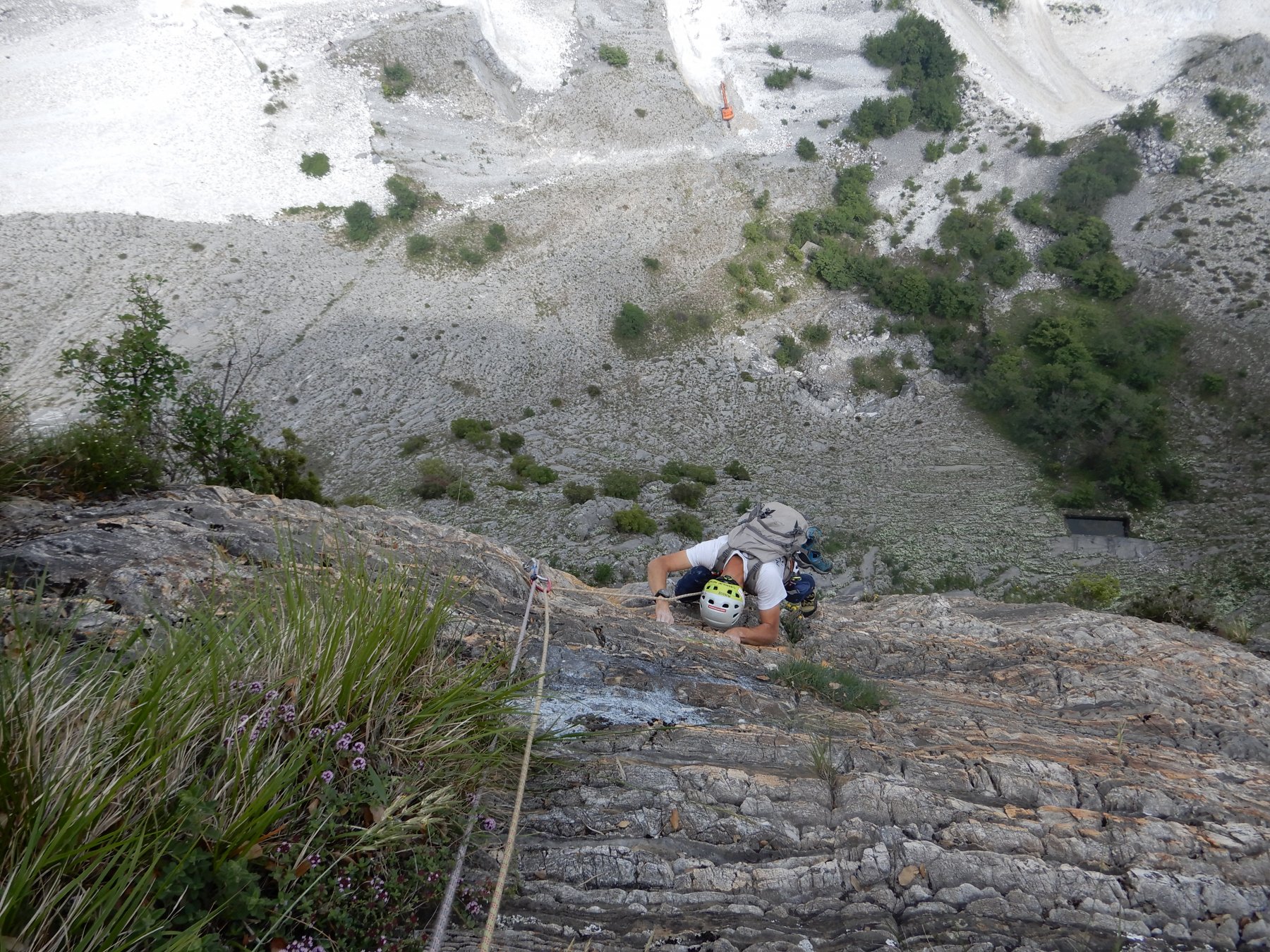 L3. Porta alla sosta che si era presa dalla calata fuori via, roccia scomposta da maneggiare con cura, 6b;