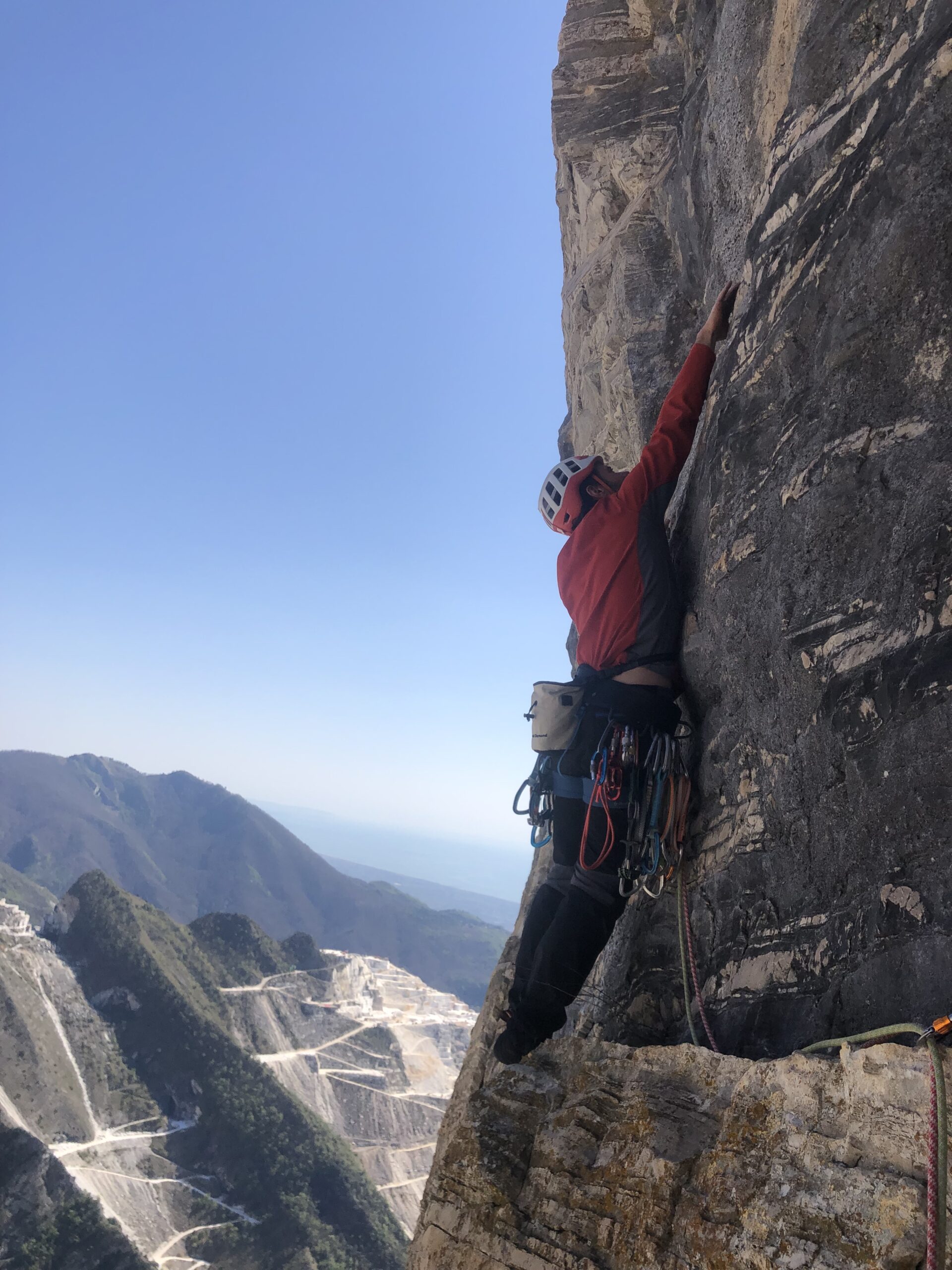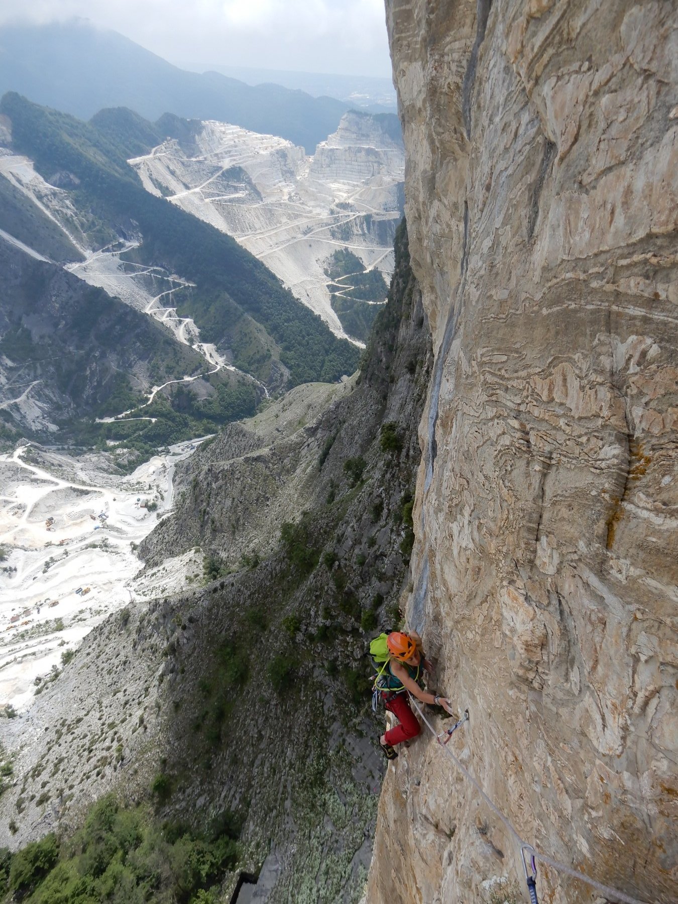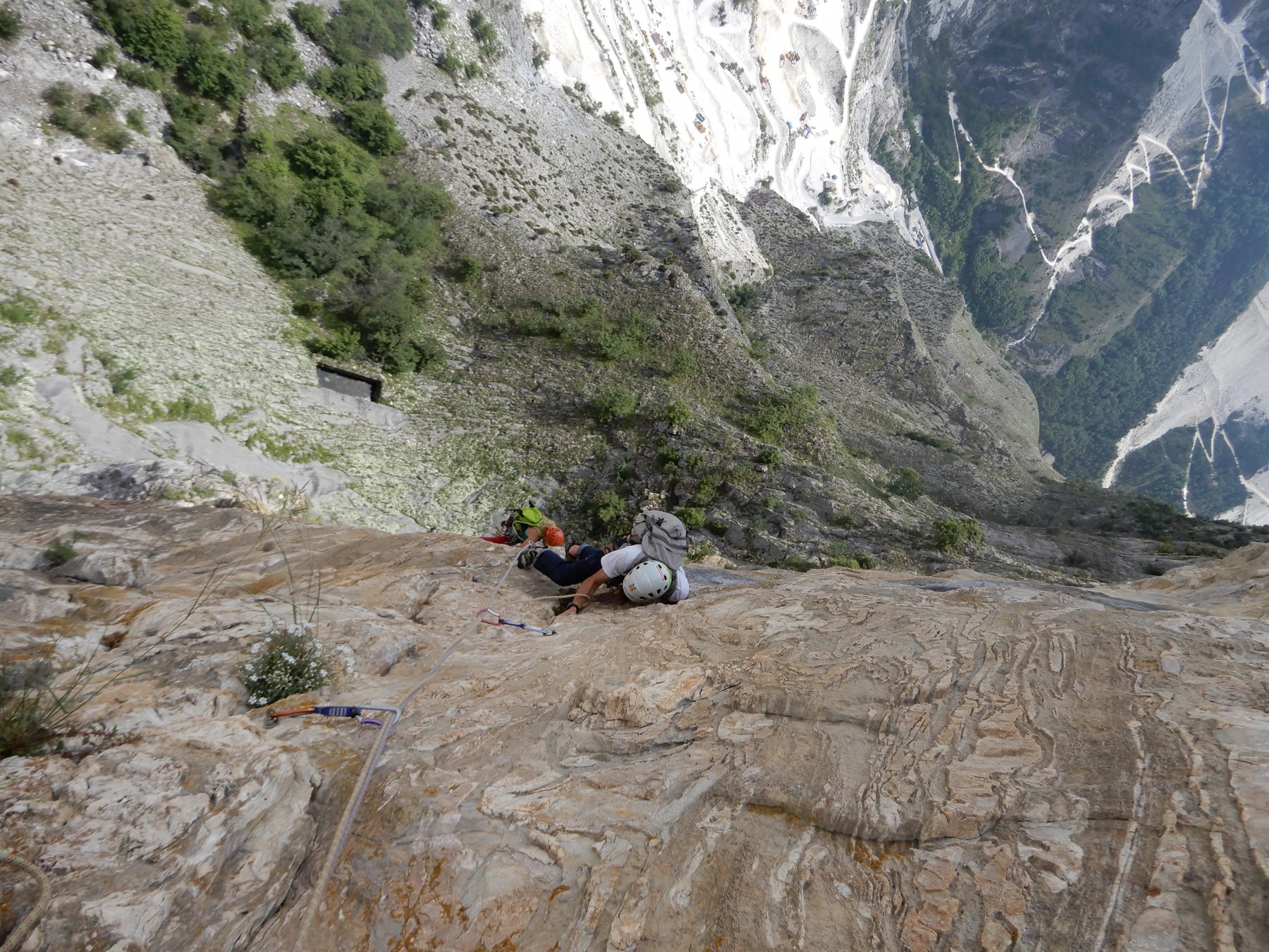 L3. Porta alla sosta che si era presa dalla calata fuori via, roccia scomposta da maneggiare con cura, 6b;