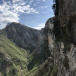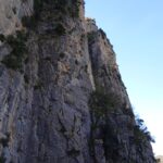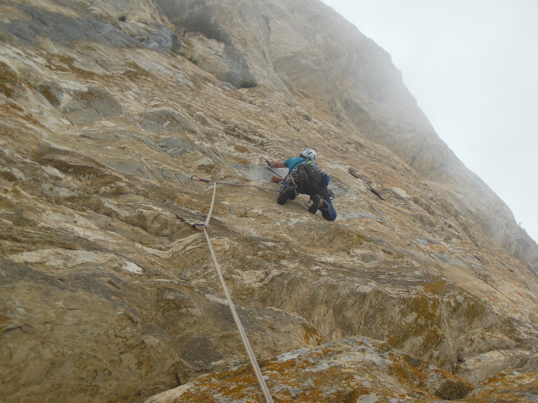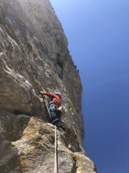 L4. Si parte molto verticali per obliquare verso sinistra, nella parte in traverso le difficoltà crescono e le prese per le mani, nella fessura, sono polverose, 6c;