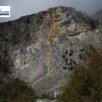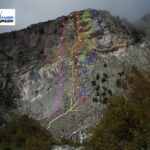 L1. Bella placca a “gocce d’acqua” con i bordi molto affilati, movimenti decisi e non banali, ci si rilassa solo al termine del tiro, obbligatorio spinto, 6b+;