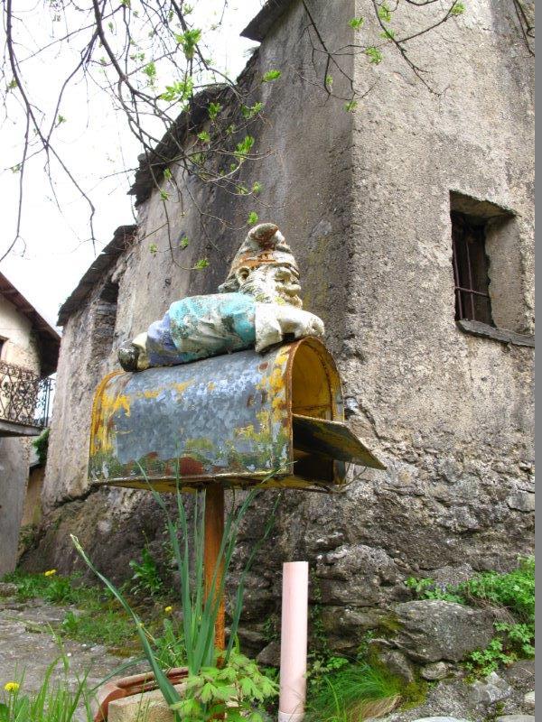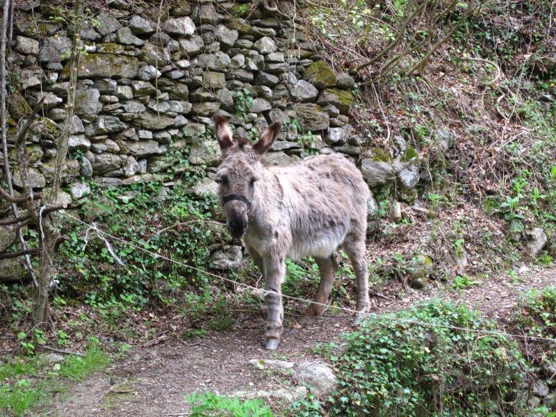 Nell’abitato di Borgo all’incrocio con la fontana sulla sinistra, prendere a destra in salita e giunti alla chiesetta diroccata, cassetta postale con gnomo sopra, girare a sinistra. Passata la casa abitata, proseguire sulla mulattiera in leggera salita e subito pianeggiante, costeggiante il recinto del cane e dell’asino.