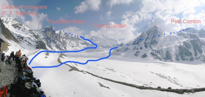 Con un largo giro verso destra (NO), puntare al marcato vallone tra i Combins de Boveire e di Corbassiere, sino al pendio terminale assai ripido sul quale ci si innalza fino al colle Q. 3563m. Scendere sul versante opposto e raggiungere la cima del Petit Combin da O dopo aver attraversato l’alto pianoro in circa mezz’ora.