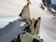 Attraversare la crepaccia terminale e risalire la cresta nel suo punto più basso presso un evidente pilastro.