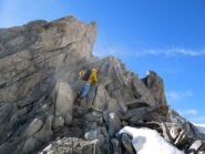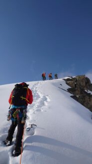 Si affronta un breve tratto meno impegnativo che porta al pendio nevoso (200 m a 35°) che porta in vetta.