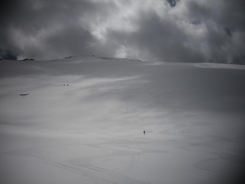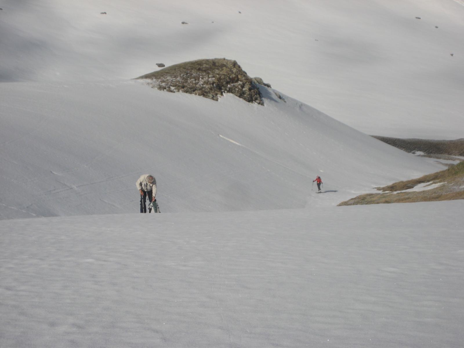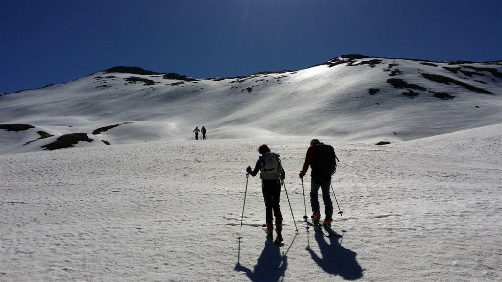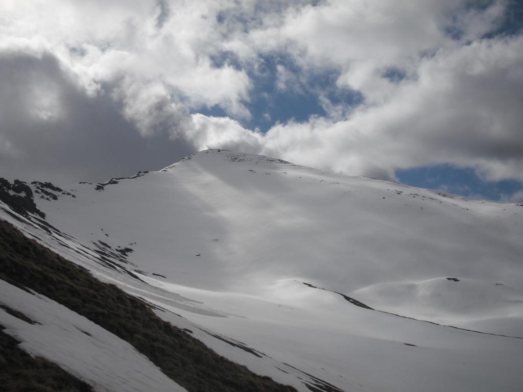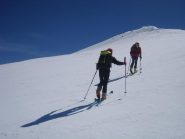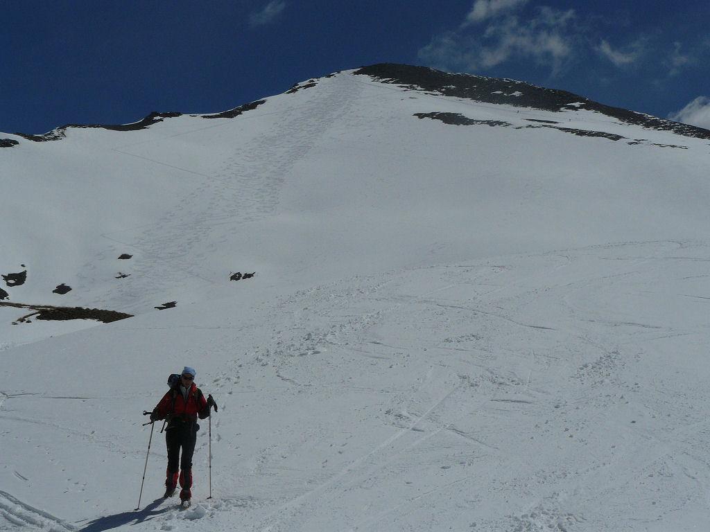 Da qui la cima è ben visibile in direzione Est. Effettuando un largo semicerchio ci si dirige verso i pendii più sostenuti che scendono dalla cima.