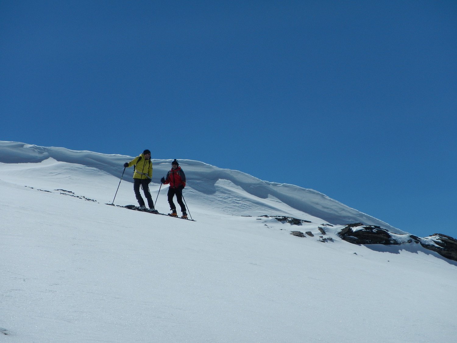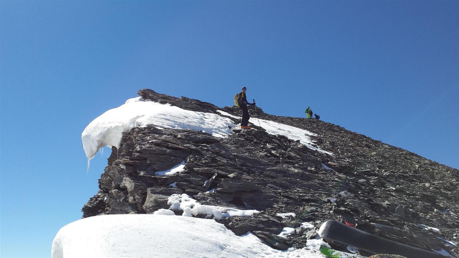 Si raggiunge la cresta ad Ovest della cima e, lasciati gli sci, si continua per roccette elementari fino in vetta.