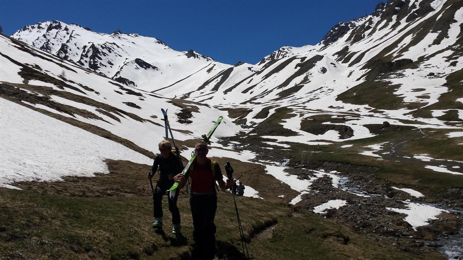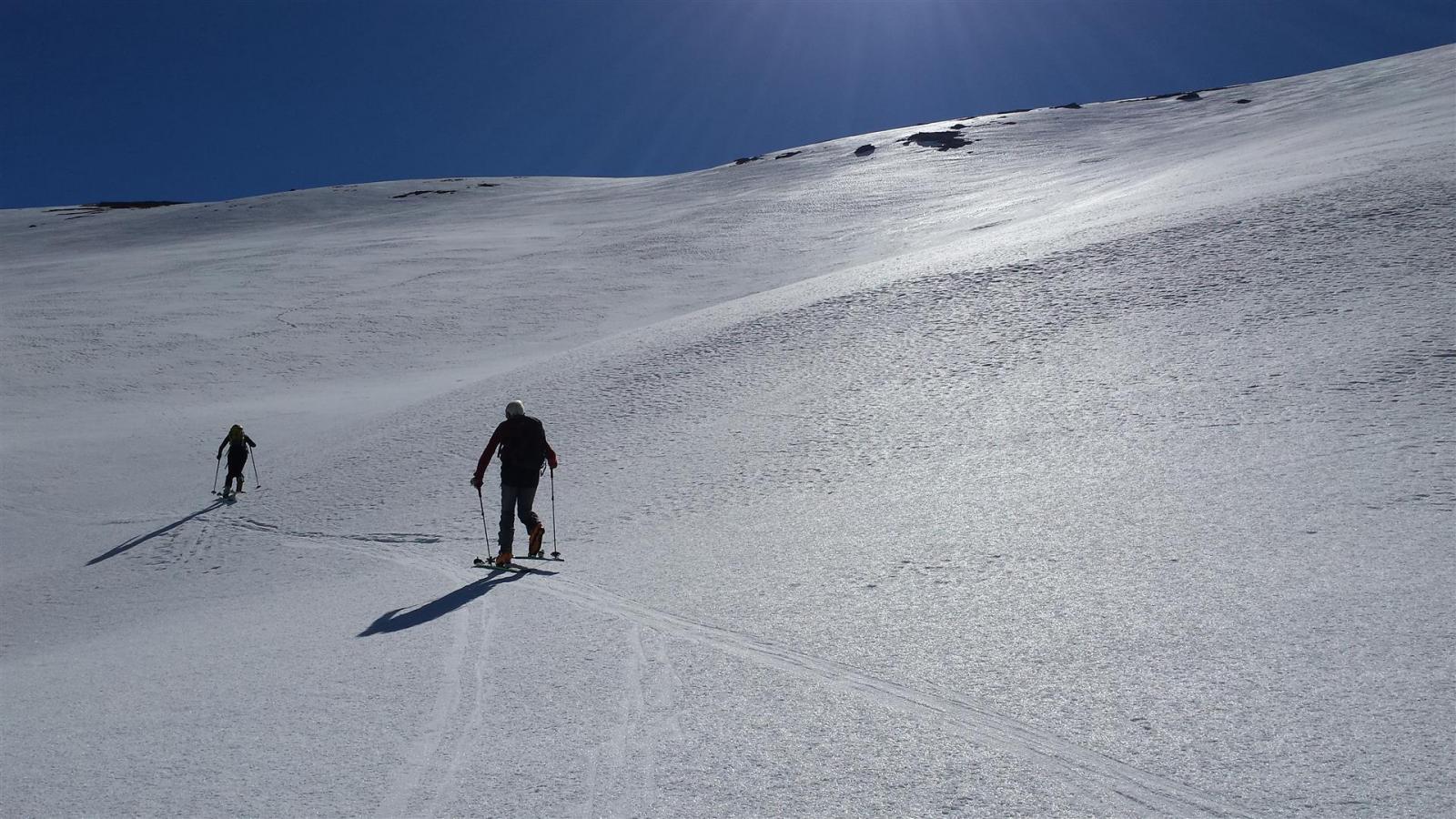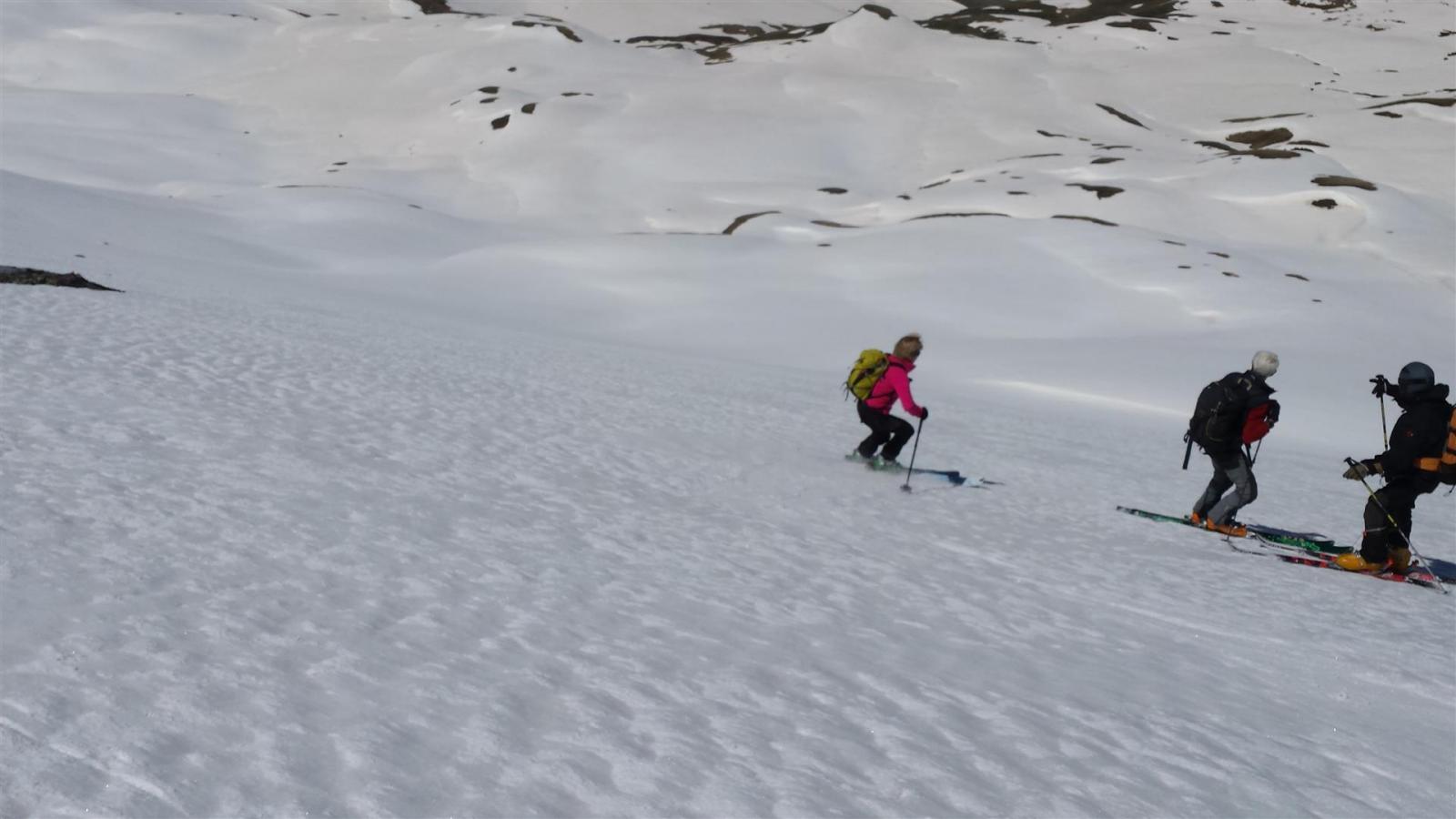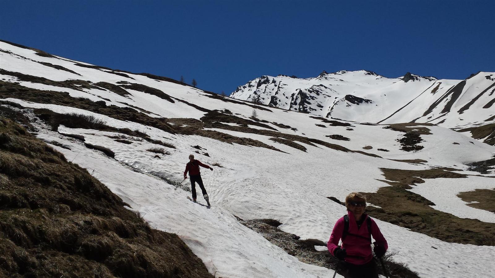 Questa volta siamo saliti verso sud seguendo il vallone del Torrent de Ventou aggirando quindi il Pic Lombard con un lungo semicerchio e percorrendo traversi con neve ed erba che permettono di calzare gli sci a quota 2300 (a mio parere in salita conviene comunque sempre percorrere la via diretta dalla dorsale del Pic Lombard per poi scendere per una 50ina di mt. e proseguire nel vallone che porta direttamente alla meta).