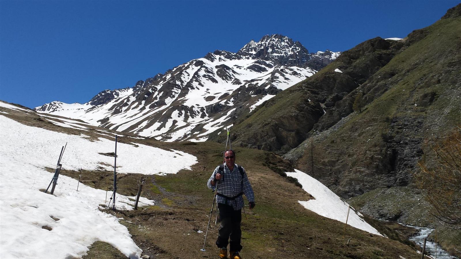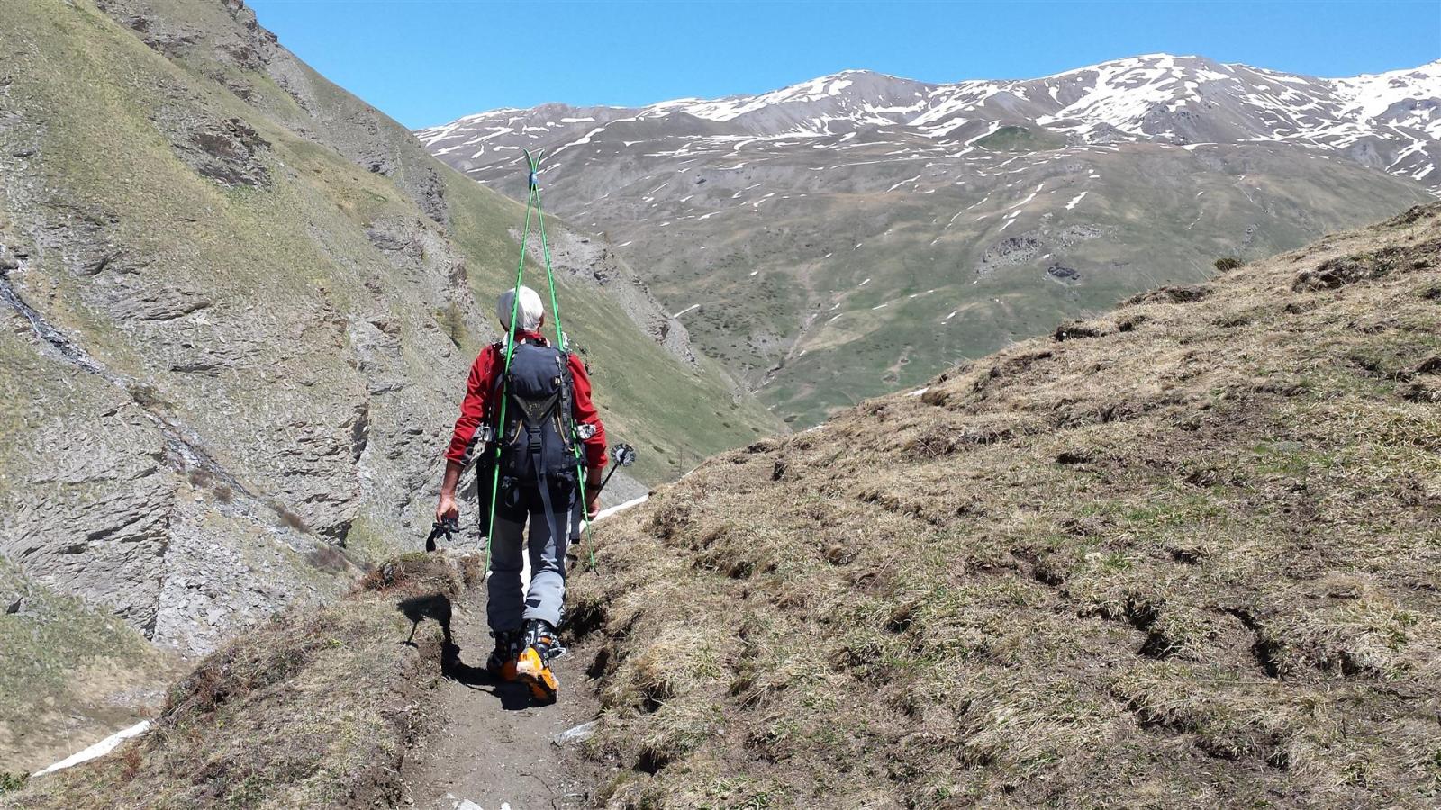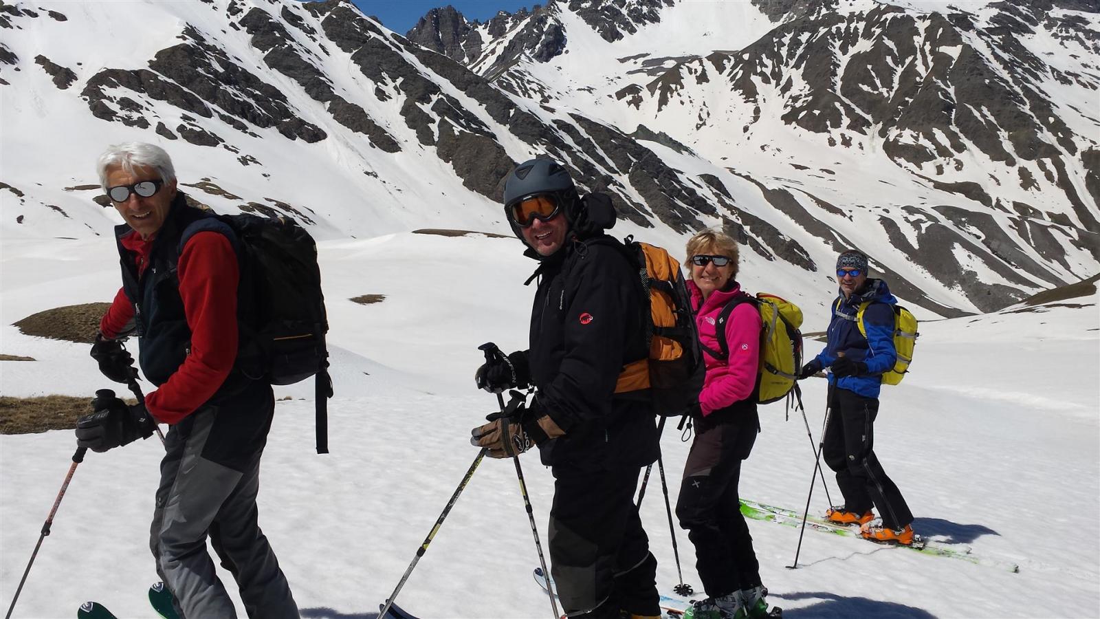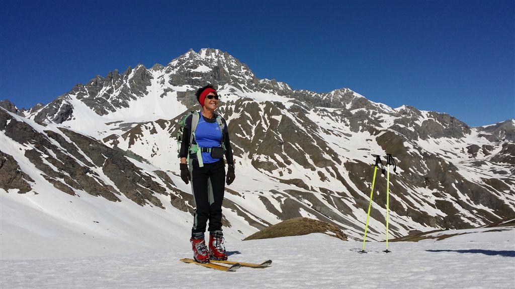 Questa volta siamo saliti verso sud seguendo il vallone del Torrent de Ventou aggirando quindi il Pic Lombard con un lungo semicerchio e percorrendo traversi con neve ed erba che permettono di calzare gli sci a quota 2300 (a mio parere in salita conviene comunque sempre percorrere la via diretta dalla dorsale del Pic Lombard per poi scendere per una 50ina di mt. e proseguire nel vallone che porta direttamente alla meta).